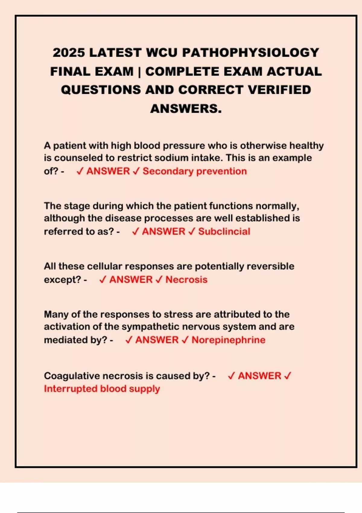 2025 LATEST WCU PATHOPHYSIOLOGY FINAL EXAM | COMPLETE EXAM ACTUAL QUESTIONS AND CORRECT VERIFIED ANSWERS.