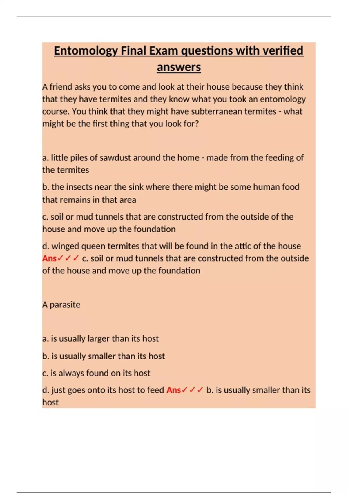 Entomology Final Exam questions with verified