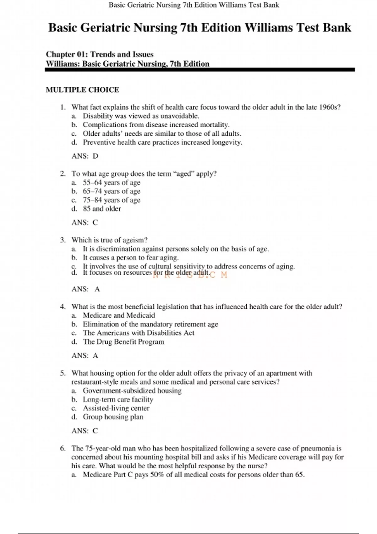 Prepare for exams with confidence using the Test Bank for Basic Geriatric Nursing, 7th Edition by Williams. This essential study aid includes hundreds of NCLEX-style questions with accurate answers and rationales, focused on the care of older adults in various healthcare settings.