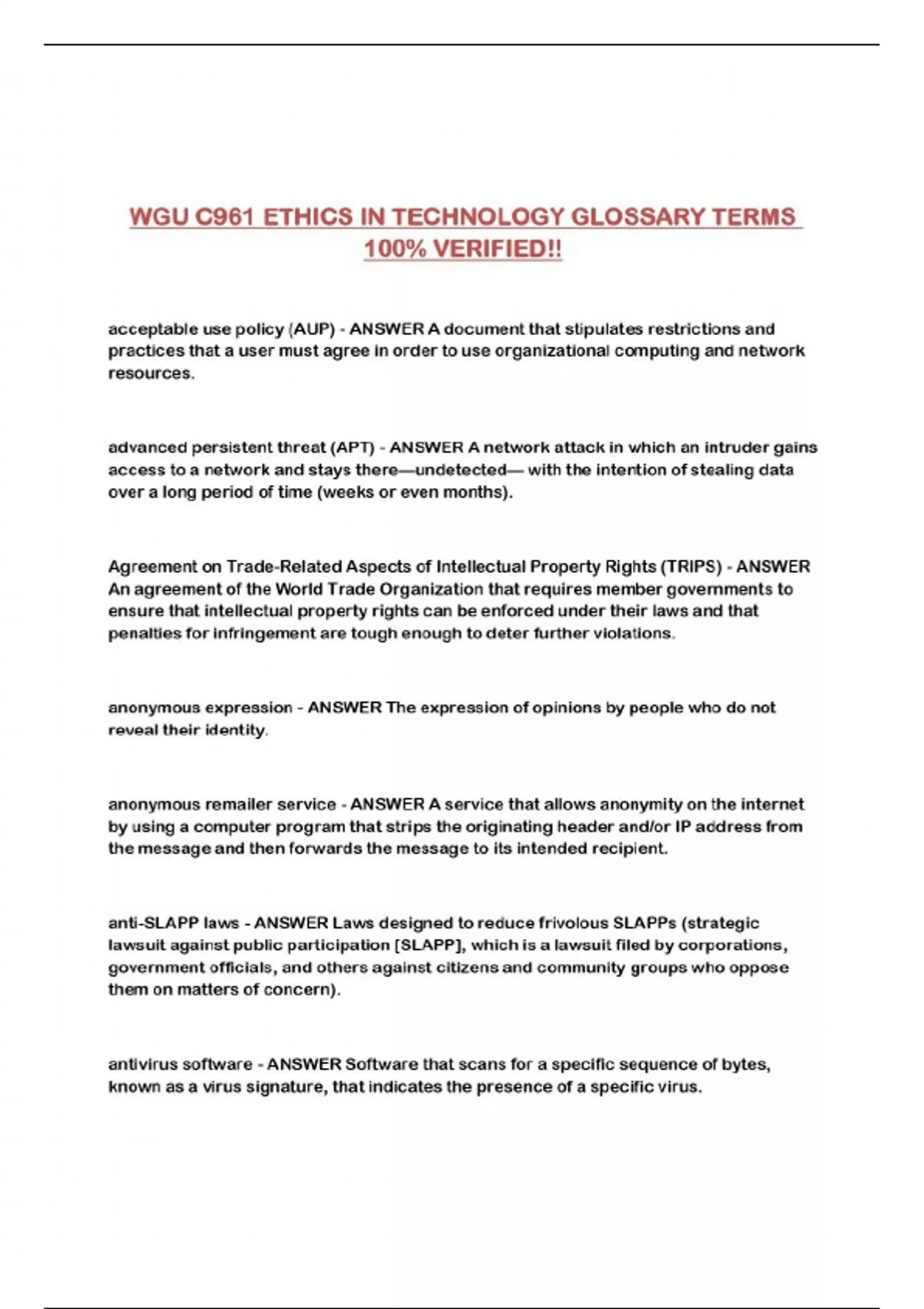 WGU C961 ETHICS IN TECHNOLOGY GLOSSARY TERMS 100% VERIFIED!!...
