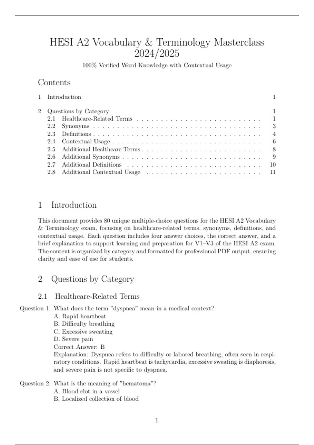 This document provides 80 unique multiple-choice questions for the HESI A2 Vocabulary