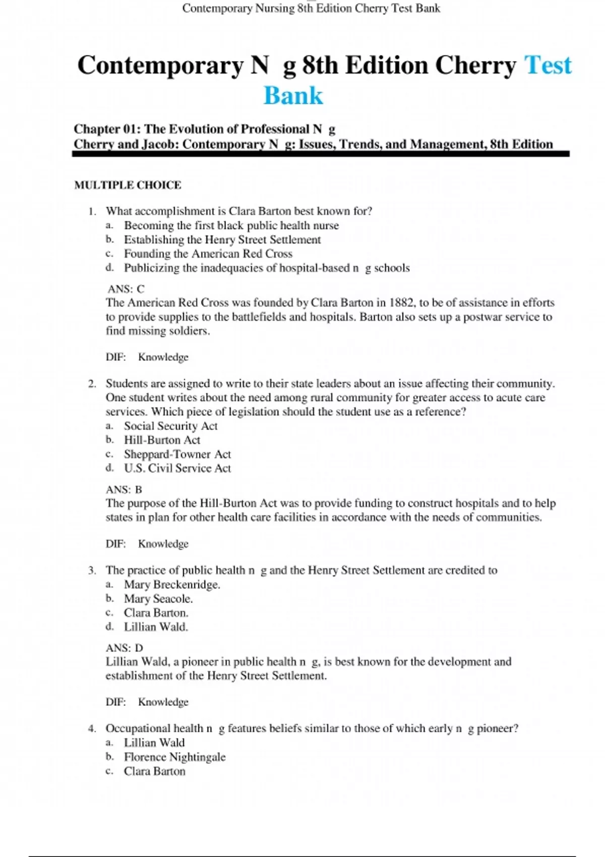Download the Test Bank for Contemporary Nursing: Issues, Trends, & Management 8th Edition by Barbara Cherry. This verified test bank includes updated multiple-choice questions and answers covering nursing leadership, healthcare policy, and current issues. Perfect for exam prep and academic success in nursing programs