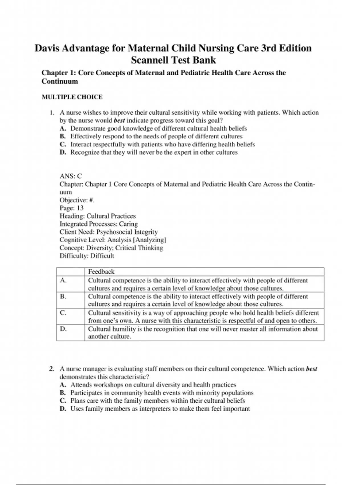 Download the complete Test Bank for Davis Advantage for Maternal Child Nursing Care 3rd Edition by Scannell, Ricci, and Kyle. This expertly crafted test bank includes NCLEX-style questions and detailed answers covering maternity, pediatric, and family-centered nursing care. A top-tier resource for nursing students preparing for exams or clinical success.