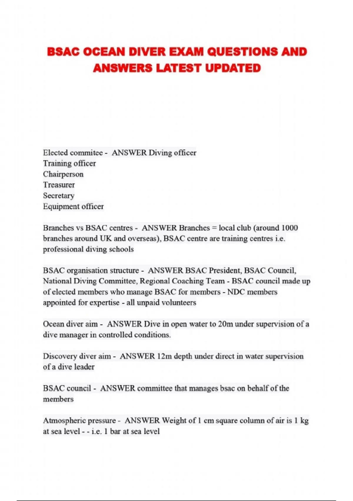 BSAC OCEAN DIVER EXAM QUESTIONS AND ANSWERS LATEST UPDATED...