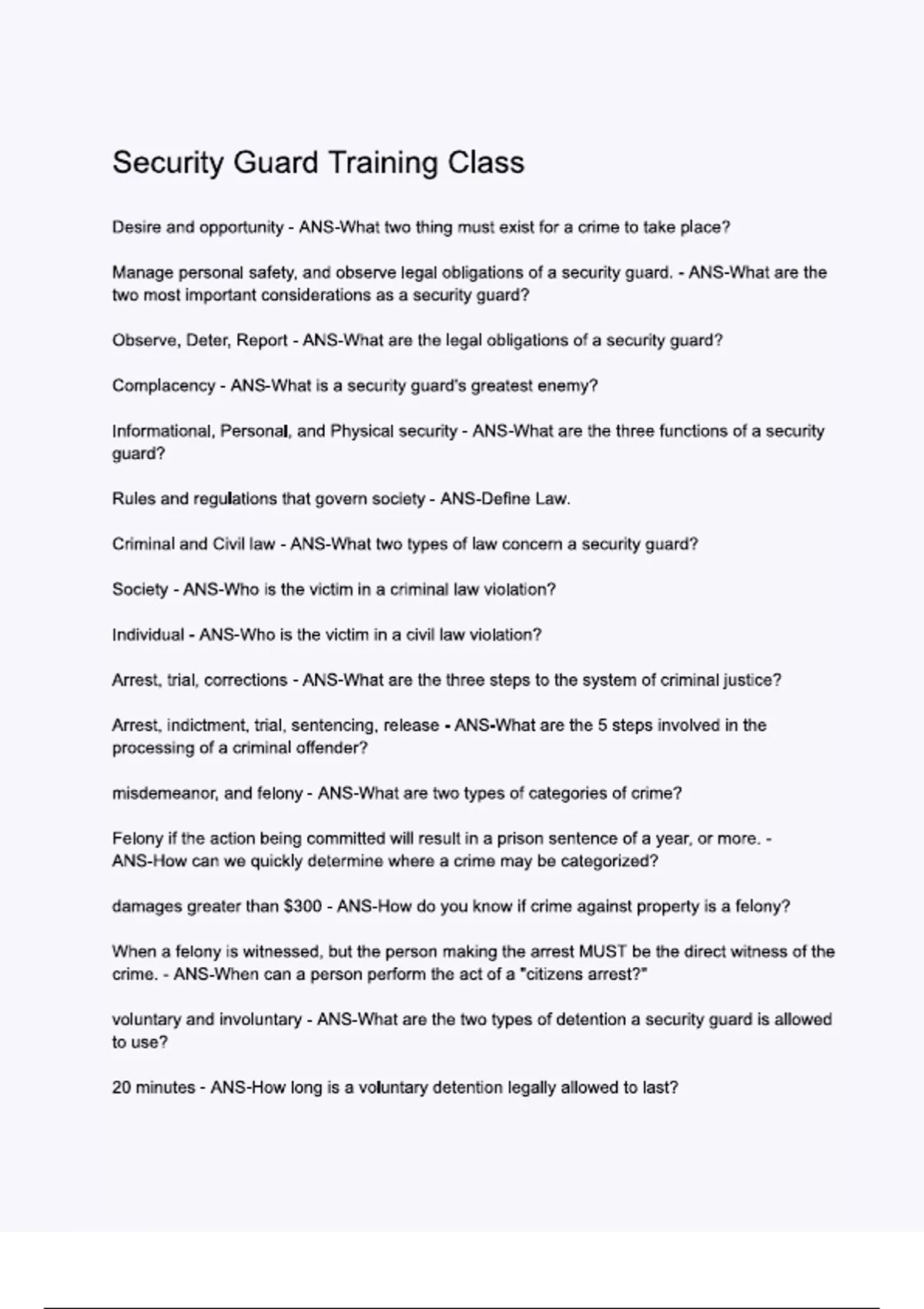Security Guard Training Class Exam questions and answers: 100% Correct Solutions (Complete Verified Answers) A+ GRADE!!!!