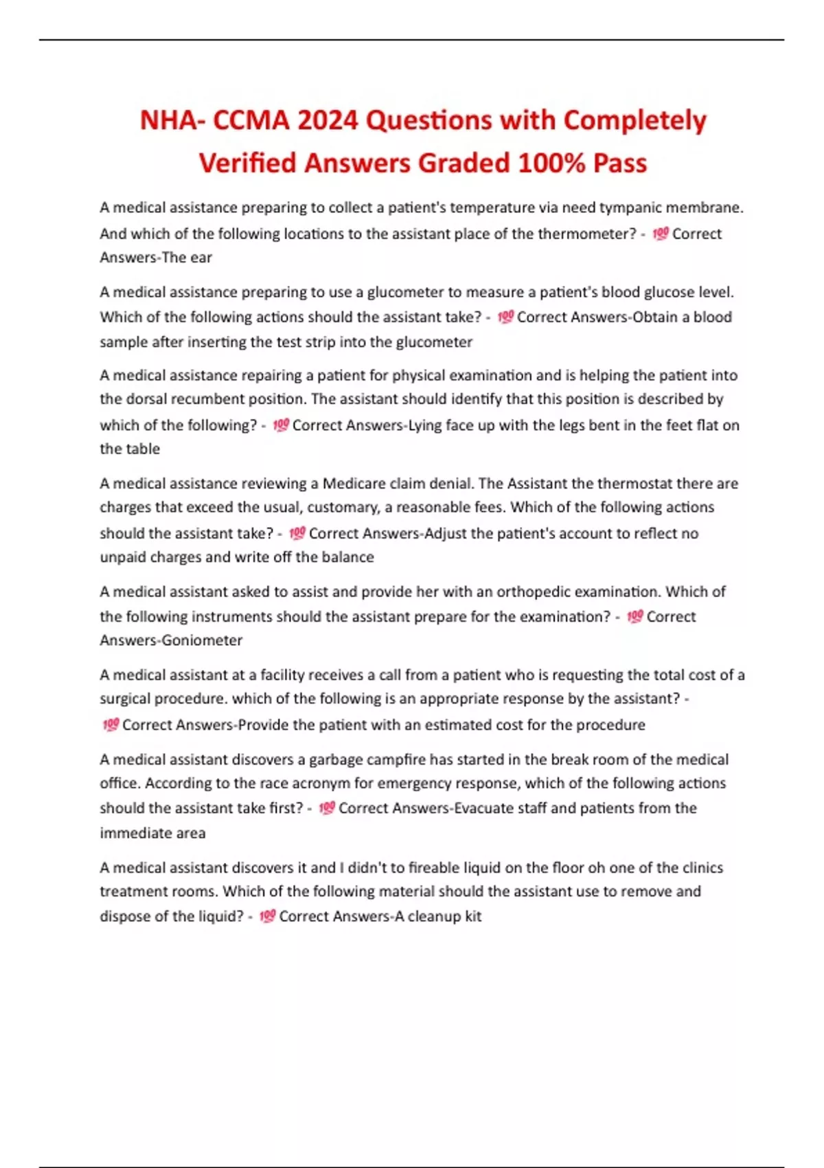 NHA- CCMA 2024 Questions with Completely Verified Answers Graded 100% Pass A medical assistance preparing to collect a patient's temperature via need tympanic membrane. And which of the following locations to the assistant place of the thermometer? - Correct Answers-The ear A medical assistance preparing to use a glucometer to measure a patient's blood glucose level. Which of the following actions should the assistant take? - Correct Answers-Obtain a blood sample after inserting the test strip into the glucometer A medical assistance repairing a patient for physical examination and is helping the patient into the dorsal recumbent position. The assistant should identify that this position is described by which of the following? - Correct Answers-Lying face up with the legs bent in the feet flat on the table A medical assistance reviewing a Medicare claim denial. The Assistant the thermostat there are charges that exceed the usual, customary, a reasonable fees. Which of the following actions should the assistant take? - Correct Answers-Adjust the patient's account to reflect no unpaid charges and write off the balance A medical assistant asked to assist and provide her with an orthopedic examination. Which of the following instruments should the assistant prepare for the examination? - Correct Answers-Goniometer