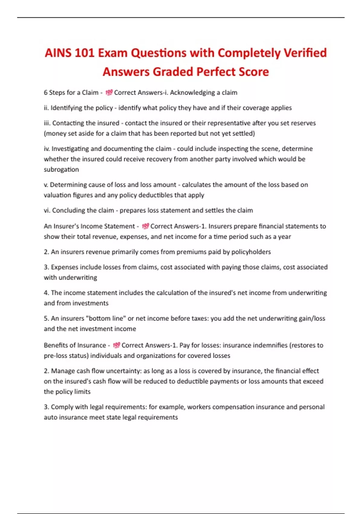 AINS 101 Exam Questions with Completely Verified Answers Graded Perfect Score 6 Steps for a Claim - Correct Answers-i. Acknowledging a claim ii. Identifying the policy - identify what policy they have and if their coverage applies iii. Contacting the insured - contact the insured or their representative after you set reserves (money set aside for a claim that has been reported but not yet settled) iv. Investigating and documenting the claim - could include inspecting the scene, determine whether the insured could receive recovery from another party involved which would be subrogation v. Determining cause of loss and loss amount - calculates the amount of the loss based on valuation figures and any policy deductibles that apply vi. Concluding the claim - prepares loss statement and settles the claim An Insurer's Income Statement - Correct Answers-1. Insurers prepare financial statements to show their total revenue, expenses, and net income for a time period such as a year 2. An insurers revenue primarily comes from premiums paid by policyholders 3. Expenses include losses from claims, cost associated with paying those claims, cost associated with underwriting 4. The income statement includes the calculation of the insured's net income from underwriting and from investments 5. An insurers "bottom line" or net income before taxes: you add the net underwriting gain/loss and the net investment income Benefits of Insurance - Correct Answers-1. Pay for losses: insurance indemnifies (restores to pre-loss status) individuals and organizations for covered losses