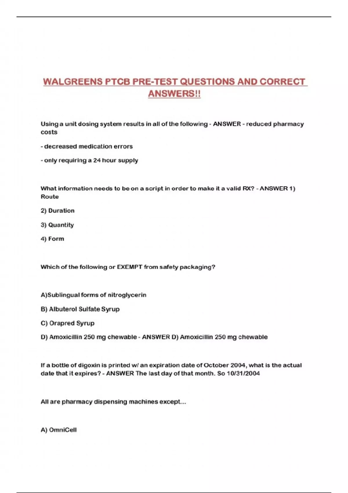WALGREENS PTCB PRE-TEST QUESTIONS AND CORRECT ANSWERS!!...
