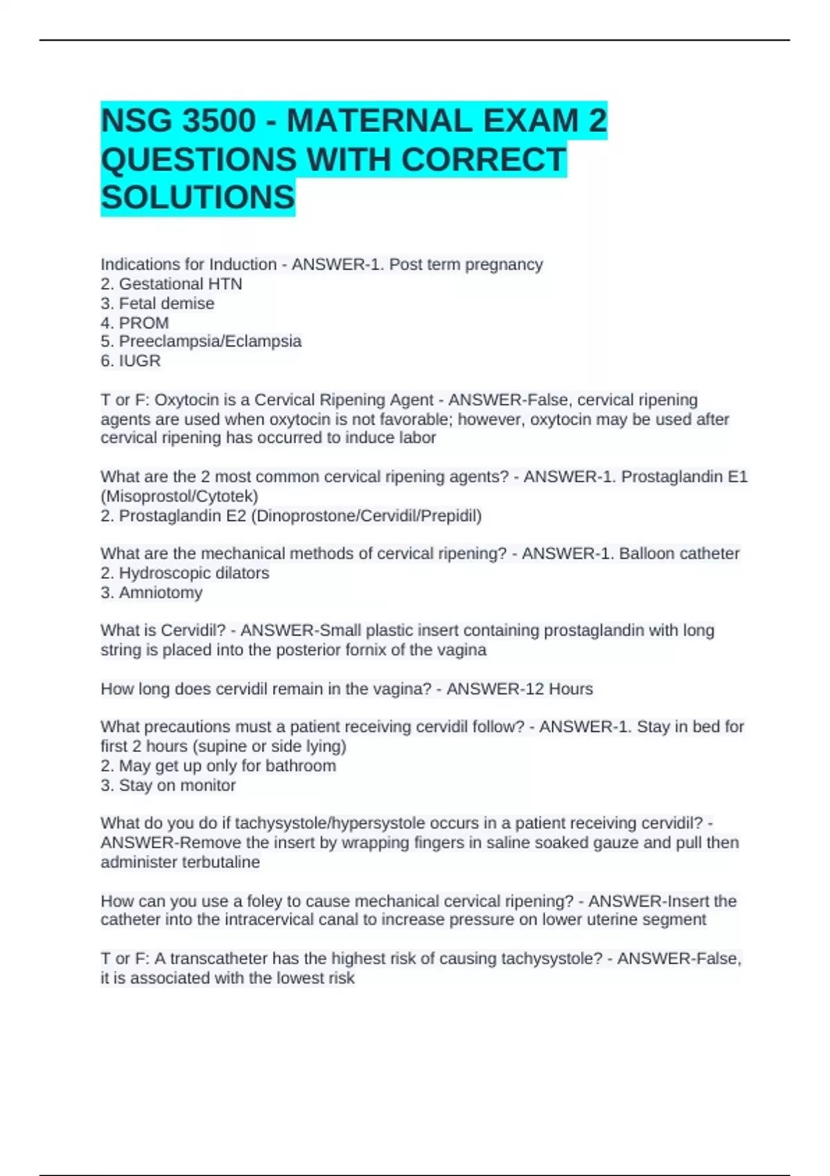 What are the 2 most common cervical ripening agents? - ANSWER-1. Prostaglandin E1
