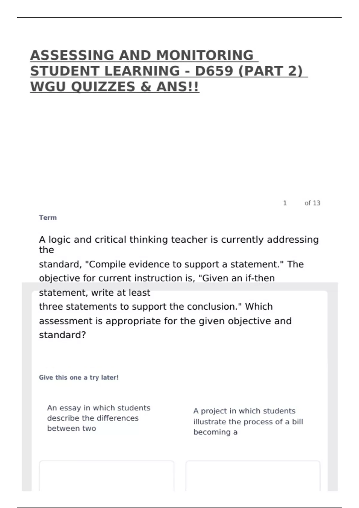 ASSESSING AND MONITORING STUDENT LEARNING - D659 (PART 2) WGU QUIZZES & ANS!!