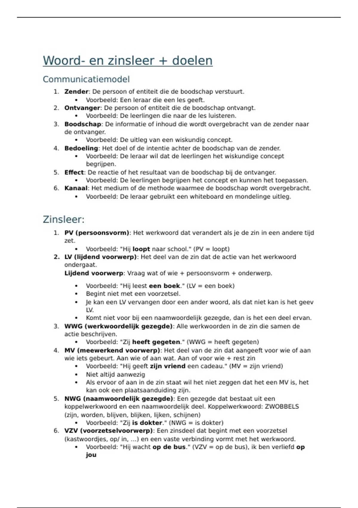 Woord- en zinsleer + doelen 1 Communicatiemodel 1 Zinsleer: 2 Woordleer: 4 Woordsoorten: 5 Werkwoord: 5 Bijvoeglijk naamwoord: 2 5 Bijwoord: 6 5 Voorzetsel: 4 6 Lidwoord: 1 6 Zelfstandig naamwoord: 3 6 Voegwoord: 7 6 Voornaamwoord: 6 Telwoord: 7 Schooltaalwoorden (deze woorden worden o.a. gebruikt in het leerplan OVSG) 7 Doelen voor Nederlands gelinkt aan het boek en leerstof 13 Taalonderwijs in de 21ste eeuw 14 Taalverwerving in de 21e eeuw 16 Mondelinge taalvaardigheid 19 Leesvaardigheid 22 Schrijfvaardigheid 25 Taalbeschouwing 28 Spelling en voortgezet technisch lezen 30 Examen: 34
