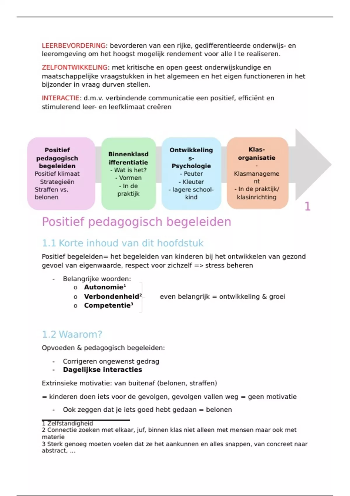 Inhoud 1 Positief pedagogisch begeleiden 1 1.1 Korte inhoud van dit hoofdstuk 1 1.2 Waarom? 1 1.3 Oorzaken van gedrag 2 1.4 Straffen en belonen, of niet? 2 1.5 Wat zijn positieve begeleidingsstrategieën? 3 1.5.1 Positief klasklimaat 3 1.5.2 Directe positieve strategieën 4 1.6 Algemene samenvatting: 6 2 Binnenklasdifferentiatie 7 2.1 Wat maakt jou uniek? 8 2.2 Diversiteit: zichtbaar & onzichtbaar 8 2.3 Omgaan met diversiteit 8 2.4 Diversiteit aanpakken via differentiatie 8 2.5 Waarom differentiëren? 8 2.5.1 Redelijke aanpassingen 10 2.5.2 DiReCoDis 10 2.6 Externe differentiatie 10 2.7 Interne differentiatie: binnenklasdifferentiatie 11 2.7.1 Differentiatie in klaspraktijk 11 2.8 Differentiëren kan in alle fasen v/h leerproces 12 2.9 Differentiatie in de praktijk 12 2.9.1 Binnen klasdifferentiatie (BKD) in de praktijk 12 2.10 Hoe kan je binnen klas differentiëren 12 2.10.1 Doelen 13 2.10.2 Leerinhoud 14 2.10.3 Instructievorm en mate van begeleiding 14 2.10.4 Werkvormen (wv): 17 2.10.5 Opdracht/ taak: 18 2.10.6 Tempo 18 2.10.7 Niveau 19 2.10.8 Groeperingsvorm 19 2.10.9 Onderwijsleermiddelen 20 2.10.10 Klasschikking & groeperingsvorm 20 2.10.11 Interesse en motivatie 21 2.10.12 Extra 22 2.11 Differentiatie in de klas? 22 2.11.1 Drie systemen tijdens de lesuren 22 3 Ontwikkelingspsychologie 6-12 jaar 23 3.1 Samenvatting 23 3.2 Fysiek – lichaam 24 3.3 Motoriek – beweging 25 3.4 Perceptie – beleving/waarneming 25 3.5 Cognitie – denken 26 3.6 Taal 28 3.7 Sociaal-emotioneel 29 3.8 Seksueel 35 3.9 Persoonlijkheid 36 3.10 Moraal 37 3.11 Schools 38 3.11.1 Leeftijd waarop een k naar grote school mag? Biologische rijpheid 38 3.11.2 Ontwikkeling: schoolrijpheid 38 3.12 Spel 43 3.13 Teken- beeld 44 3.14 ‘Anders’ ontwikkelen 44 4 Klasmanagement 45 4.1 De vijf pijlers van Patterson 46 4.1.1 PIJLER 1- : structuur en duidelijkheid 46 4.1.2 Pijler 2-: Opvolgen regels + toezicht 47 4.1.3 Pijler 3+ Positieve betrokkenheid en engagement 48 4.1.4 Pijler 4+ positieve bekrachtiging 48 4.1.5 Pijler 5+: Probleem oplossend 48 4.2 Klasmanagement en groepsdynamica 49 4.3 Wat kan je doen? 50 4.4 Manieren om je klas rustig te krijgen 50 4.5 VC/NVC/PVC 51 4.6 Para verbale communicatie? 51 4.7 Concrete vormen van communicatie? 51 4.8 Observeren Best zonder emoties Anders ... Interpretatie! 51 4.8.1 Observeren => I => rapporteren? 51 4.9 Binnen- en buitengrenzen. Vier manieren van ingrijpen gebaseerd op het al dan niet raken aan de klassfeer. 52 4.9.2 Iedereen heeft zijn grenzen! Zorg gewoon dat ze daar nooit overgaan! 53 4.10 Zelfdeterminatietheorie 56