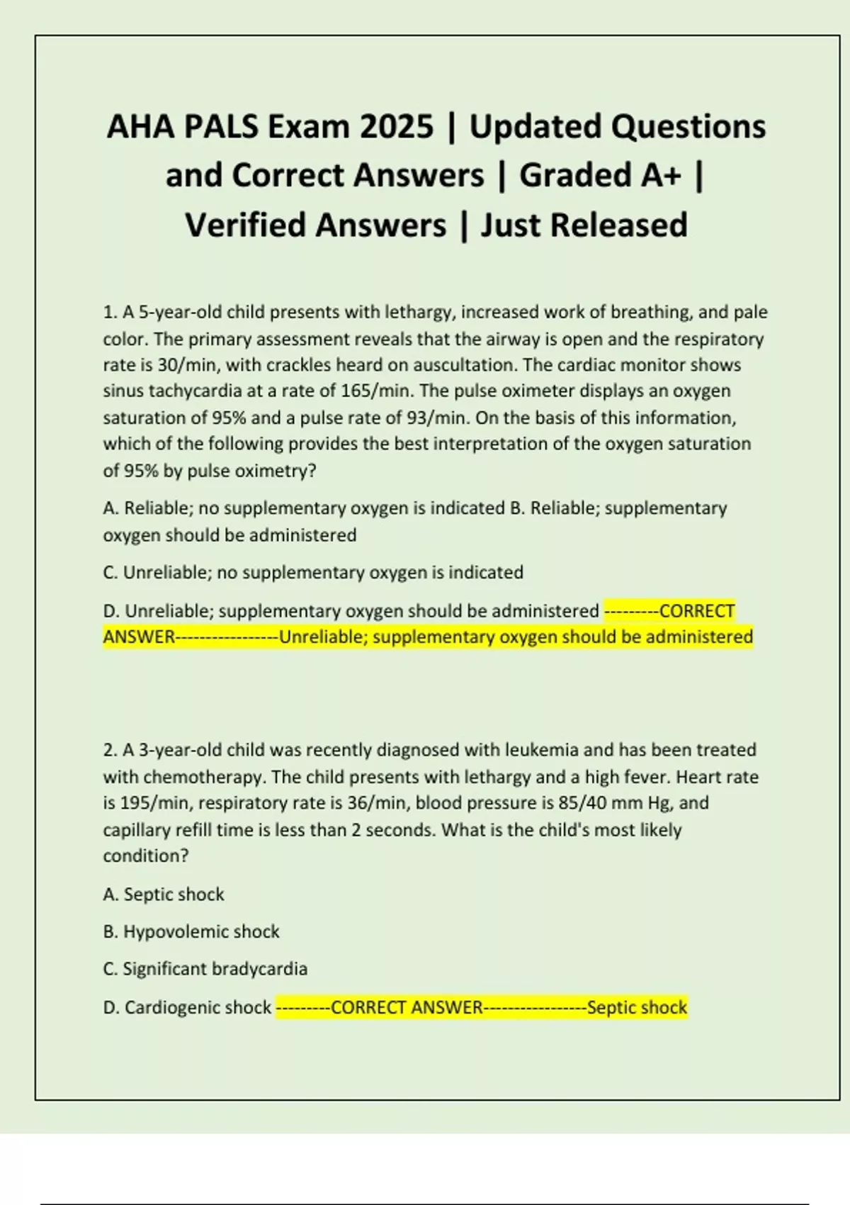 1. A 5-year-old child presents with lethargy, increased work of breathing, and pale