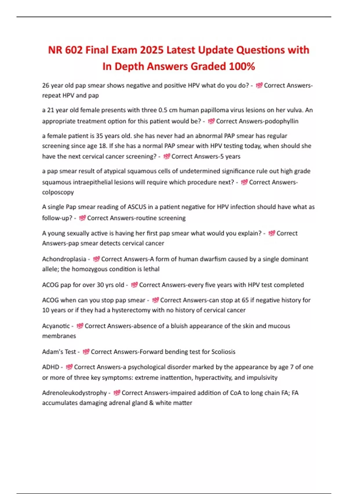 NR 602 Final Exam 2025 Latest Update Questions with In Depth Answers Graded 100% 26 year old pap smear shows negative and positive HPV what do you do? - Correct Answersrepeat HPV and pap a 21 year old female presents with three 0.5 cm human papilloma virus lesions on her vulva. An appropriate treatment option for this patient would be? - Correct Answers-podophyllin a female patient is 35 years old. she has never had an abnormal PAP smear has regular screening since age 18. If she has a normal PAP smear with HPV testing today, when should she have the next cervical cancer screening? - Correct Answers-5 years a pap smear result of atypical squamous cells of undetermined significance rule out high grade squamous intraepithelial lesions will require which procedure next? - Correct Answerscolposcopy A single Pap smear reading of ASCUS in a patient negative for HPV infection should have what as follow-up? - Correct Answers-routine screening A young sexually active is having her first pap smear what would you explain? - Correct Answers-pap smear detects cervical cancer Achondroplasia - Correct Answers-A form of human dwarfism caused by a single dominant allele; the homozygous condition is lethal ACOG pap for over 30 yrs old - Correct Answers-every five years with HPV test completed ACOG when can you stop pap smear - Correct Answers-can stop at 65 if negative history for 10 years or if they had a hysterectomy with no history of cervical cancer Acyanotic - Correct Answers-absence of a bluish appearance of the skin and mucous membranes Adam's Test - Correct Answers-Forward bending test for Scoliosis
