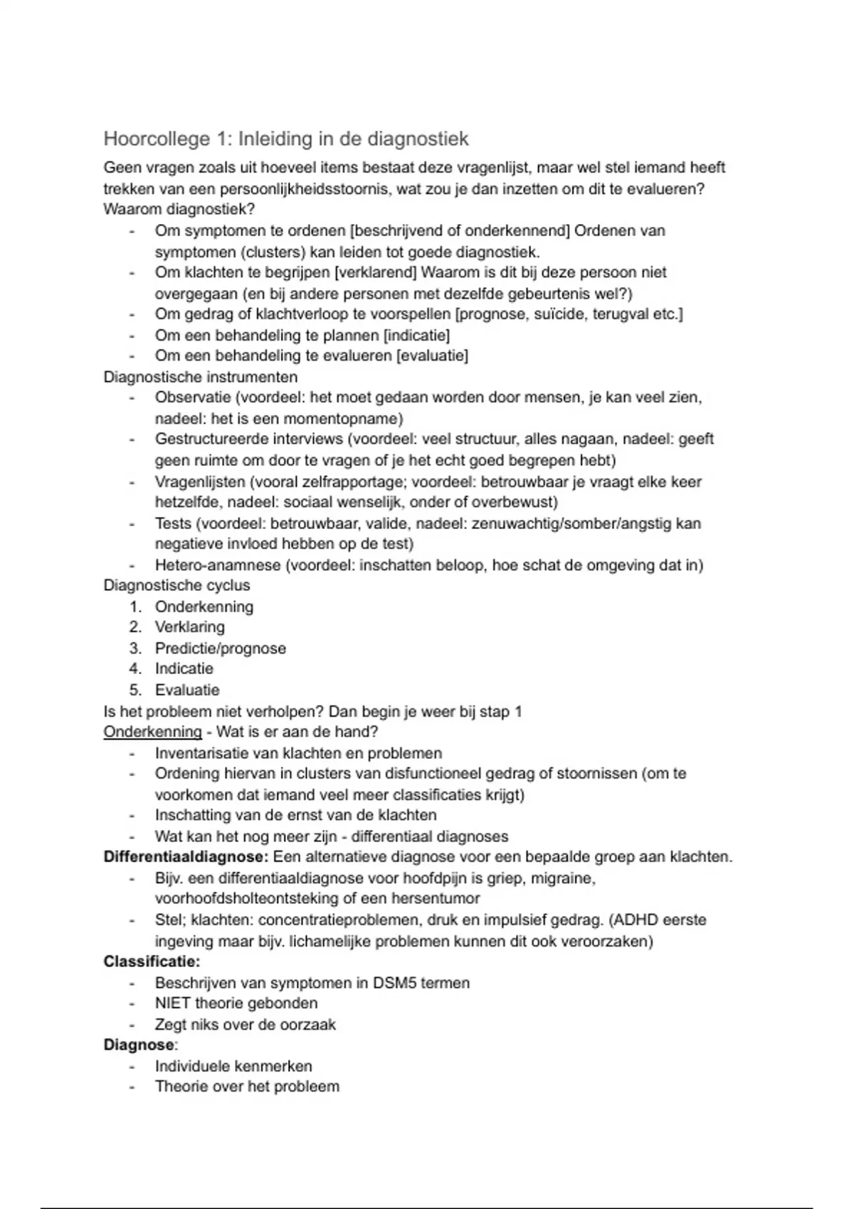 Collegedictaat van 29 pagina's voor het vak Diagnostiek in de klinische psychologie aan de UU (HC 1 t/m 6)