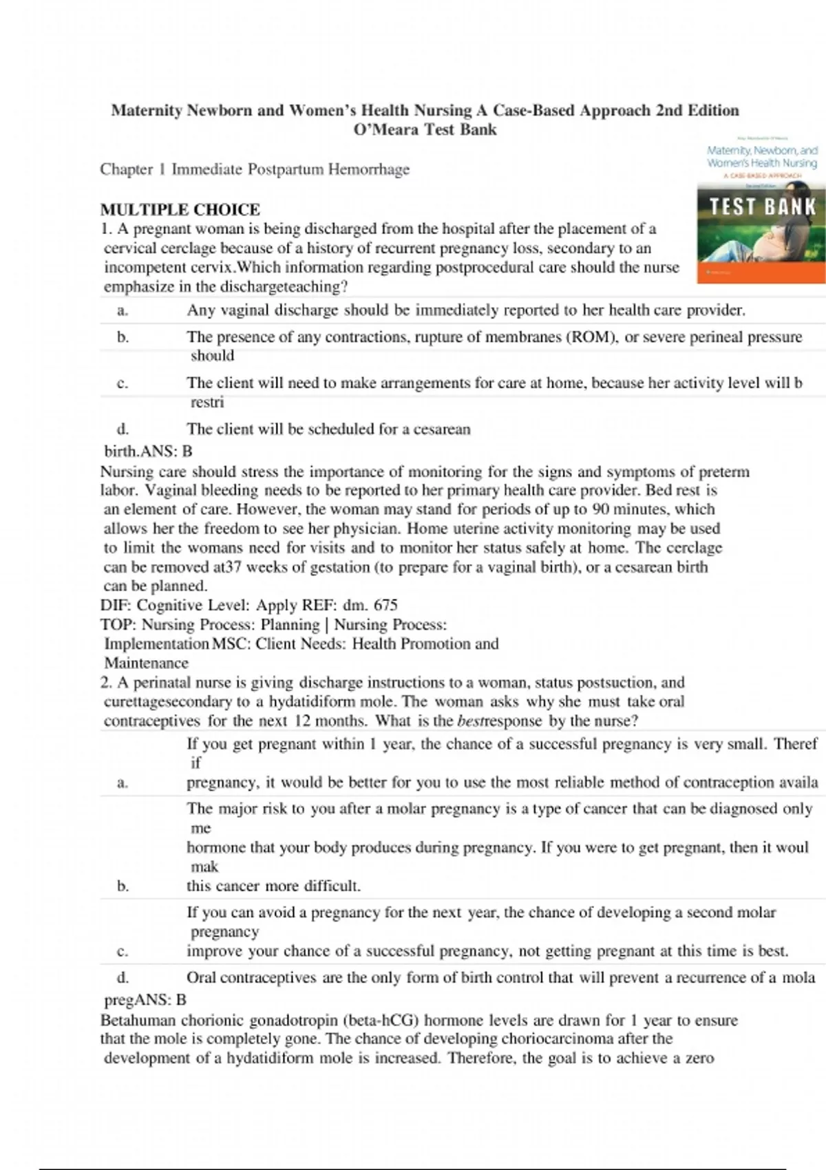 Test Bank for Maternity, Newborn, and Women’s Health Nursing: A Case-Based Approach 2nd Edition by Amy O’Meara