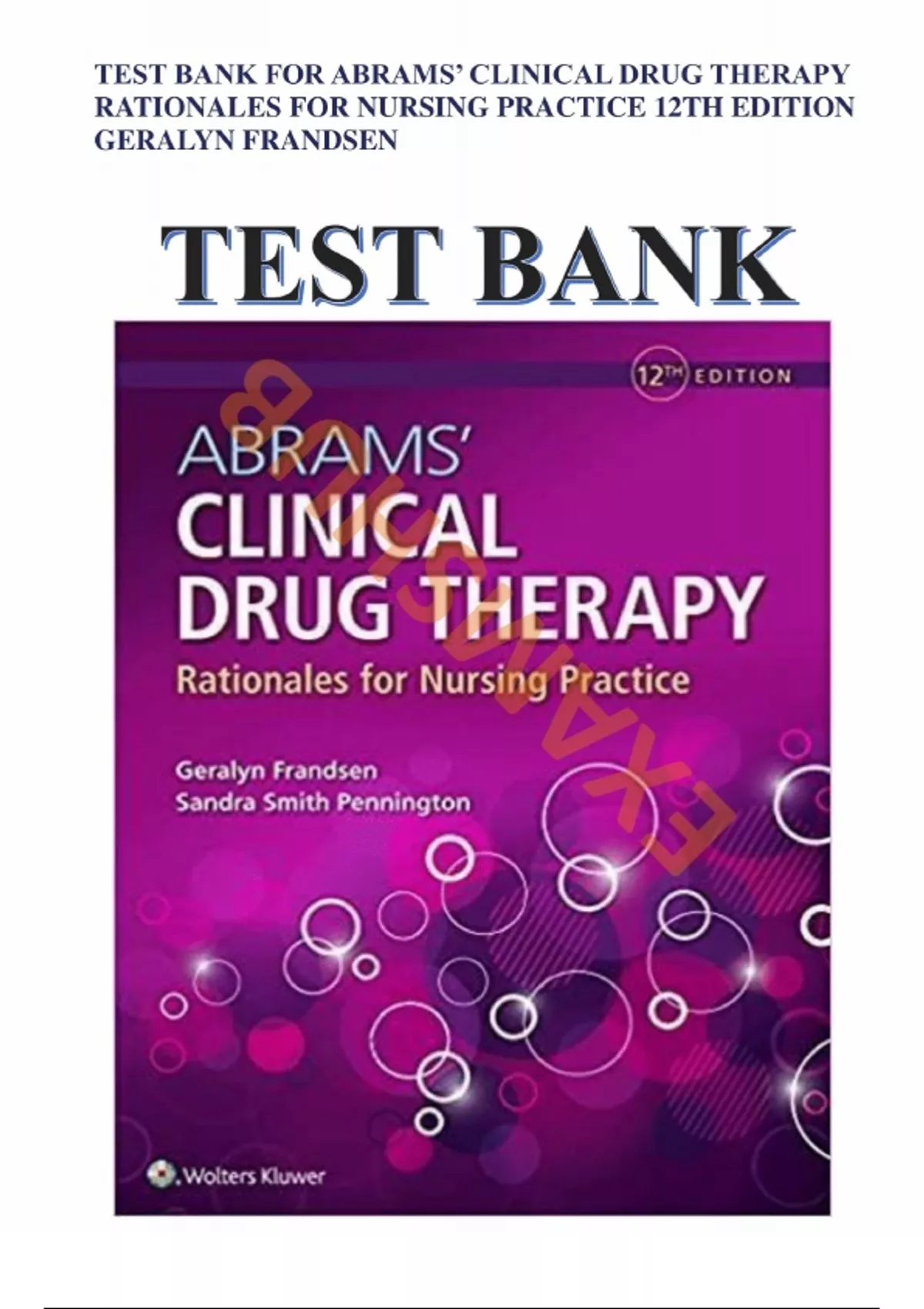 Test Bank For Abrams Clinical Drug Therapy Rationales for Nursing Practice 12th Edition By Geralyn Frandsen; Sandra S. Pennington. 1 The Foundation of Pharmacology: Quality and Safety 2 Basic Concepts and Processes 3 Medication Administration and the Nursing Process of Drug Therapy 4 Pharmacology and the Care of Infants and Pediatric Patients 5 Pharmacology and the Care of Adults and Geriatric Patients 6 Pharmacology and the Care of Pregnant or Lactating Women 7 Pharmacology and Women’s Health 8 Pharmacology and Men’s Health 5-Alpha Reductase Inhibitors 9 Drug Therapy for Coagulation Disorders 10 Drug Therapy for Dyslipidemia 11 Drug Therapy for Hematopoietic Disorders 12 Drug Therapy: Immunizations 13 Drug Therapy to Decrease Immunity 14 Drug Therapy for the Treatment of Cancer 15 Inflammation, Infection, and the Use of Antimicrobial Agents 16 Drug Therapy to Decrease Pain, Fever, and Inflammation 17 Drug Therapy With Corticosteroids 18 Drug Therapy With Beta-Lactam Antibacterial Agents 19 Drug Therapy With Aminoglycosides and Fluoroquinolones 20 Drug Therapy With Tetracyclines, Sulfonamides, and Urinary Antiseptics 21 Drug Therapy With Macrolides and Miscellaneous Anti-infective Agents 22 Drug Therapy for Tuberculosis and Mycobacterium Avium Complex Disease 23 Drug Therapy for Viral Infections 24 Drug Therapy for Fungal Infections 25 Drug Therapy for Parasitic Infections 26 Drug Therapy for Hypertension 27 Drug Therapy for Dysrhythmias 28 Drug Therapy for Coronary Heart Disease 29 Drug Therapy for Shock and Hypotension 30 Drug Therapy for Heart Failure 31 Drug Therapy for Nasal Congestion and Cough 32 Drug Therapy to Decrease Histamine Effects and Allergic Response 33 Drug Therapy for Asthma, Airway Inflammation, and Bronchoconstriction 34 Drug Therapy for Fluid Volume Excess 35 Nutritional Support Products, Vitamins, and Mineral Supplements 36 Drug Therapy for Weight Management 37 Drug Therapy for Peptic Ulcer Disease and Hyperacidity 38 Drug Therapy for Nausea and Vomiting 5-Hydroxytryptamine3 (5-HT3) or Serotonin Receptor Antagonists 39 Drug Therapy for Constipation and Elimination Problems 40 Drug Therapy for Diarrhea 41 Drug Therapy for Diabetes Mellitus 42 Drug Therapy for Hyperthyroidism and Hypothyroidism 43 Drug Therapy for Pituitary and Hypothalamic Dysfunction 44 Drug Therapy to Regulate Calcium and Bone Metabolism 45 Drug Therapy for Adrenal Cortex Disorders 46 Physiology of the Autonomic and Central Nervous Systems and Indications for the Use of Drug Therapy 47 Drug Therapy for Myasthenia Gravis, Alzheimer’s Disease, and Other Conditions Treated with Cholinergic Agents 48 Drug Therapy for Parkinson’s Disease, Urinary Spasticity, and Disorders Requiring Anticholinergic Drug Therapy 49 Drug Therapy With Opioids 50 Drug Therapy With Local Anesthetics 51 Drug Therapy With General Anesthetics 52 Drug Therapy for Migraine and Other Headaches 53 Drug Therapy for Seizure Disorders and Skeletal Muscle Disorders 54 Drug Therapy for Anxiety and Insomnia 55 Drug Therapy for Depression and Mood Stabilization 56 Drug Therapy for Psychotic Disorders 57 Drug Therapy for Attention Deficit Hyperactivity Disorder and Narcolepsy 58 Drug Therapy for Substance Use Disorders 59 Drug Therapy for Disorders of the Eye 60 Drug Therapy for Disorders of the Ear 61 Drug Therapy for Disorders of the Skin