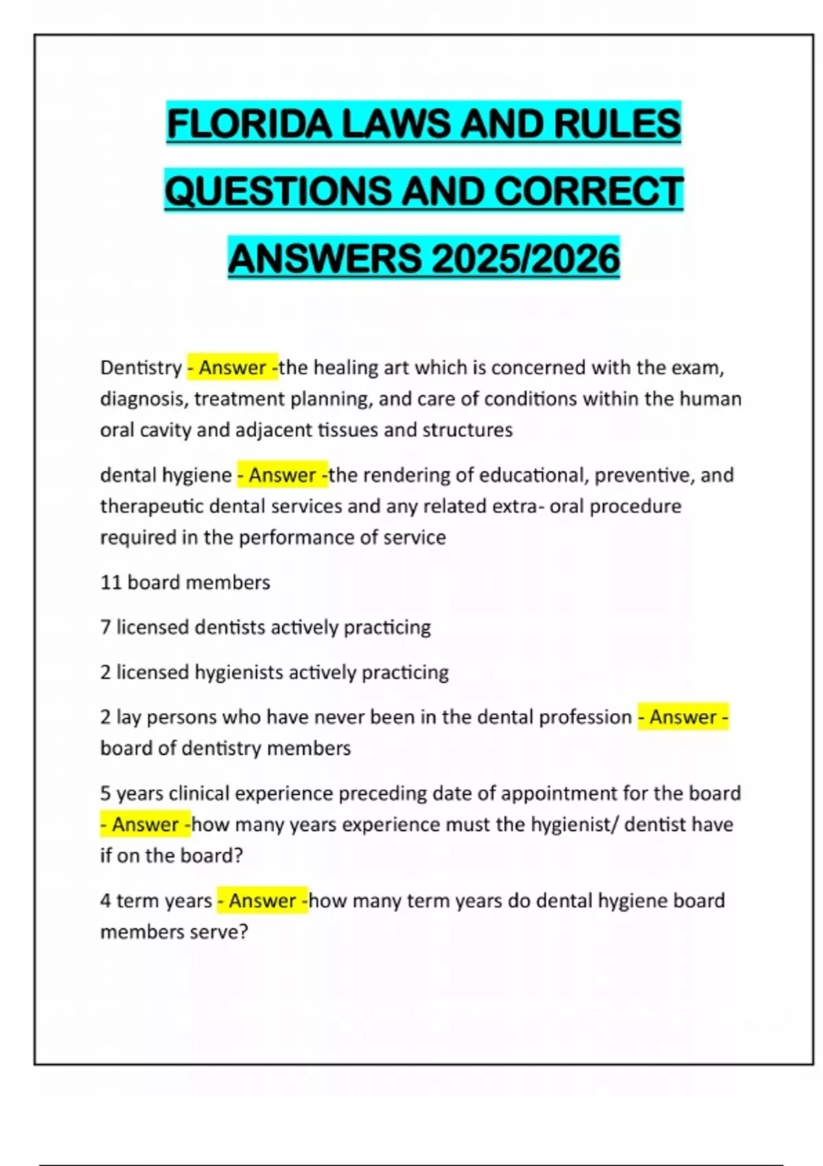 FLORIDA LAWS AND RULES QUESTIONS AND CORRECT ANSWERS 2025/2026 Dentistry - Answer -the healing art which is concerned with the exam, diagnosis, treatment planning, and care of conditions within the human oral cavity and adjacent tissues and structures dental hygiene - Answer -the rendering of educational, preventive, and therapeutic dental services and any related extra- oral procedure required in the performance of service 11 board members 7 licensed dentists actively practicing 2 licensed hygienists actively practicing 2 lay persons who have never been in the dental profession - Answer - board of dentistry members 5 years clinical experience preceding date of appointment for the board - Answer -how many years experience must the hygienist/ dentist have if on the board? 4 term years - Answer -how many term years do dental hygiene board members serve?10 years - Answer -what is the maximum number of years a board member may serve? governor of florida - Answer -who appoints the board of dentistry members? 60 years old - Answer -one member of the board must be at least? true- only if defined by law or rule - Answer -remediable tasks may be delegated if they pose no risk dentists - Answer -who delegates NON- dentists? 13 months - Answer -authorization of irremediable tasks under general supervision is valid for? irremediable tasks - Answer -intraoral treatment tasks which are irreversible and create unalterable changes within the oral cavity or structures remediable tasks - Answer -intraoral treatment tasks which are reversible and do not create unalterable changes within the oral cavity or structures and do not cause an increased risk to the patient irremediable - Answer -applying topical with jet spray is what type of task remediable - Answer -a dental hygienist who applies bleaching solution, activates light source, monitors and removes in office bleaching materials is performing a _______ task. irremediable - Answer -the use of a laser or a laser type device is considered to be what type of task?