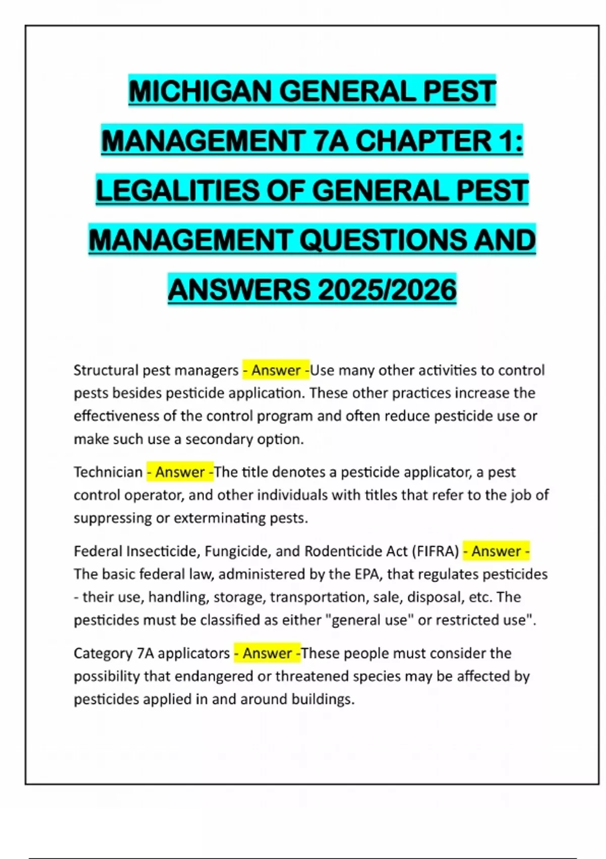 MICHIGAN GENERAL PEST MANAGEMENT 7A CHAPTER 1: LEGALITIES OF GENERAL PEST MANAGEMENT QUESTIONS AND ANSWERS 2025/2026 Structural pest managers - Answer -Use many other activities to control pests besides pesticide application. These other practices increase the effectiveness of the control program and often reduce pesticide use or make such use a secondary option. Technician - Answer -The title denotes a pesticide applicator, a pest control operator, and other individuals with titles that refer to the job of suppressing or exterminating pests. Federal Insecticide, Fungicide, and Rodenticide Act (FIFRA) - Answer - The basic federal law, administered by the EPA, that regulates pesticides - their use, handling, storage, transportation, sale, disposal, etc. The pesticides must be classified as either "general use" or restricted use". Category 7A applicators - Answer -These people must consider the possibility that endangered or threatened species may be affected by pesticides applied in and around buildings.Natural Resources and Environmental Protection Act,