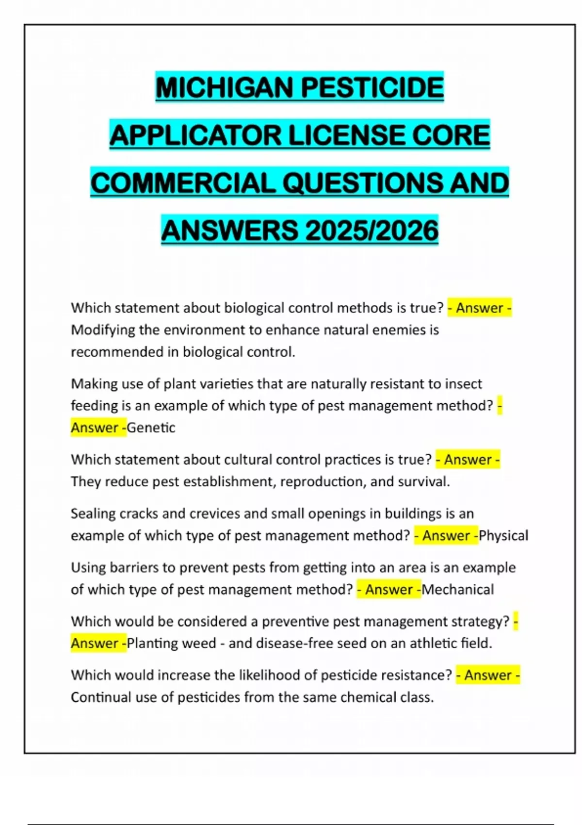 MICHIGAN PESTICIDE APPLICATOR LICENSE CORE COMMERCIAL QUESTIONS AND ANSWERS 2025/2026 Which statement about biological control methods is true? - Answer - Modifying the environment to enhance natural enemies is recommended in biological control. Making use of plant varieties that are naturally resistant to insect feeding is an example of which type of pest management method? - Answer -Genetic Which statement about cultural control practices is true? - Answer - They reduce pest establishment, reproduction, and survival. Sealing cracks and crevices and small openings in buildings is an example of which type of pest management method? - Answer -Physical Using barriers to prevent pests from getting into an area is an example of which type of pest management method? - Answer -Mechanical Which would be considered a preventive pest management strategy? - Answer -Planting weed - and disease-free seed on an athletic field. Which would increase the likelihood of pesticide resistance? - Answer - Continual use of pesticides from the same chemical class.Monitoring pests at airports and ocean ports that pose a serious threat to public health or widespread damage to crops or animals is an example of which type of pest management method? - Answer - Regulatory Which statement about action thresholds is true? - Answer -The action threshold for a pest may be set at a zero pest population density. Which statement about pest management strategies in Integrated Pest Management (IPM) is true? - Answer -The goal is to prevent pests from reaching damaging levels. In Michigan, commercial applicators do not have to maintain records or general-use pesticides but must keep records of restricted-use pesticides for three years following the application. T/F - Answer -False If off-target drift is anticipated because of the nature of the application, a drift management plan must be in place. T/F - Answer -True In Michigan, empty pesticide containers that have been triple-rinsed or power-rinsed and punctured may be brought to an MDARD recycling facility or disposed of in a regular licensed Type II sanitary landfill T/F - Answer -True The MIOSHA Right-to-Know Act requires employers to obtain and retain Safety Data Sheets (SDS) on all hazardous chemicals (including pesticides) for employee review. T/F - Answer -True Your first response after a pesticide spill is to immediately clean it up. T/F - Answer -False In Michigan, commercial applicators may also become approved trainers of registered applicators. T/F - Answer -True