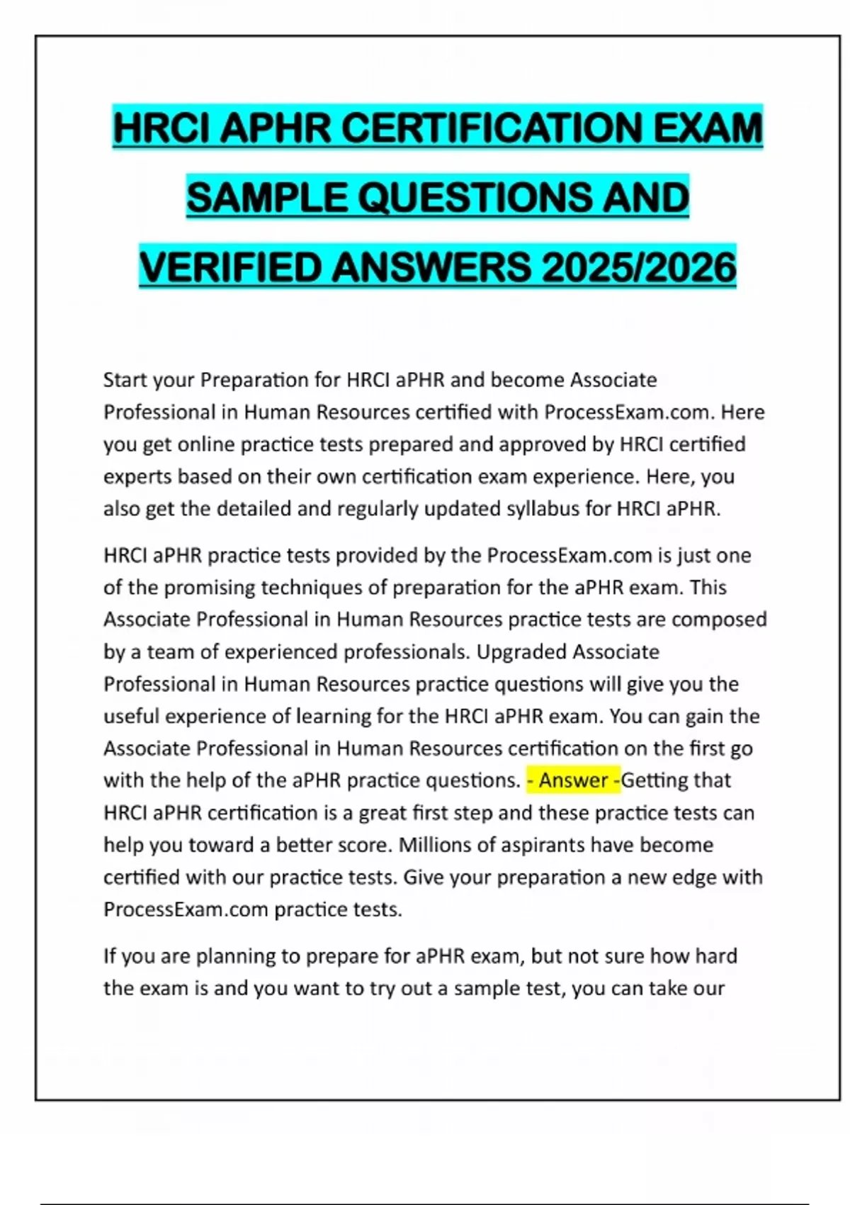HRCI APHR CERTIFICATION EXAM SAMPLE QUESTIONS AND VERIFIED ANSWERS 2025/2026 Start your Preparation for HRCI aPHR and become Associate Professional in Human Resources certified with ProcessE. Here you get online practice tests prepared and approved by HRCI certified experts based on their own certification exam experience. Here, you also get the detailed and regularly updated syllabus for HRCI aPHR. HRCI aPHR practice tests provided by the ProcessE is just one of the promising techniques of preparation for the aPHR exam. This Associate Professional in Human Resources practice tests are composed by a team of experienced professionals. Upgraded Associate Professional in Human Resources practice questions will give you the useful experience of learning for the HRCI aPHR exam. You can gain the Associate Professional in Human Resources certification on the first go with the help of the aPHR practice questions. - Answer -Getting that HRCI aPHR certification is a great first step and these practice tests can help you toward a better score. Millions of aspirants have become certified with our practice tests. Give your preparation a new edge with ProcessE practice tests. If you are planning to prepare for aPHR exam, but not sure how hard the exam is and you want to try out a sample test, you can take ouraPHR practice test. To help you assess your readiness, we've developed a set of HRCI aPHR sample questions and assembled them into a free online test exam. - Answer -Online Practice Test: