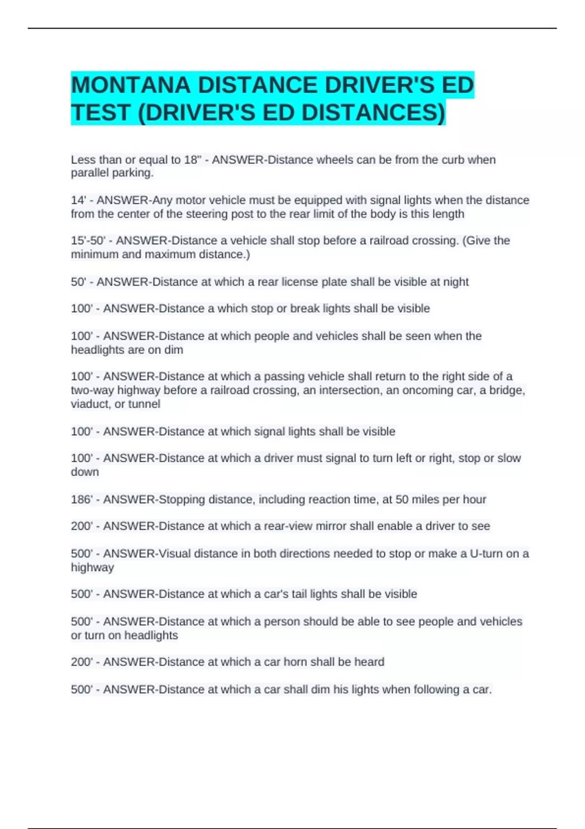 MONTANA DISTANCE DRIVER'S ED TEST (DRIVER'S ED DISTANCES)