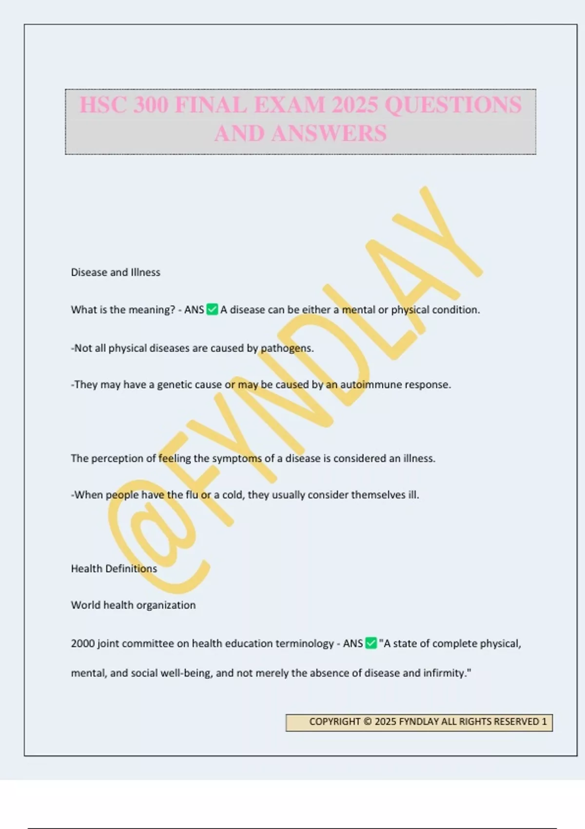 Disease and Illness What is the meaning? - ANS A disease can be either a mental or physical condition. -Not all physical diseases are caused by pathogens. -They may have a genetic cause or may be caused by an autoimmune response. The perception of feeling the symptoms of a disease is considered an illness. -When people have the flu or a cold, they usually consider themselves ill. Health Definitions World health organization 2000 joint committee on health education terminology - ANS "A state of complete physical, mental, and social well-being, and not merely the absence of disease and infirmity." HSC 300 FINAL EXAM 2025 QUESTIONS AND ANSWERS COPYRIGHT © 2025 FYNDLAY ALL RIGHTS RESERVED 2 (World Health Organization) "A quality of life involving dynamic interaction and independence among the individual's physical well-being, his (sic) mental and emotional reactions, the social complex in which he (sic) exists." (2000 Joint Committee on Health Education Terminology) "An integrated method of functioning that is oriented toward maximizing the potential of which the individual is capable." (2000 Joint Committee on Health Education Terminology) Illness Prevention Versus Health Enhancement - ANS Illness Prevention -Avoiding illness is highest priority -Motivated by return to health or alleviation of symptoms -Minimal goal -Desire immediate or short-term results -Need measurable results -Time-limited activity COPYRIGHT © 2025 FYNDLAY ALL RIGHTS RESERVED 3 -Medical-centered motivation -Authority dominated -Fear as motivator -External checks mandatory -External rewards -Specific behaviors -Reactive (to symptoms or threat of symptoms) Health Enhancement -High health is high priority. Enjoy healthy behaviors. -Motivated by feeling good, better, or best -Maximal goal -Desire long-term results -More nebulous results are OK -On-going activity -Ego-centric motivation -Internal control COPYRIGHT © 2025 FYNDLAY ALL RIGHTS RESERVED 4 -Accomplishment as motivator -Few external checks -Internal rewards -Diffuse behaviors -Proactive (doesn't need negative force) Orthodox Medicine Practices? - ANS Orthodox medicine is also known as traditional medicine. Practitioners of orthodox medicine include Physicians, Dentists, Nurses, Social Workers, Health Educators, etc. There are two types of traditional physicians: -An allopathic physician is the medical doctor (MD). -An osteopathic physician is the DO. -Both have similar academic trainin