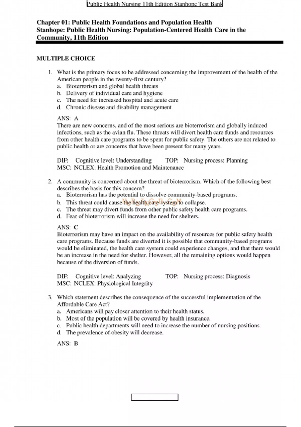 Download the complete Test Bank for Public Health Nursing: Population-Centered Health Care in the Community, 11th Edition by Stanhope. This test bank features NCLEX-style questions covering community health principles, epidemiology, health promotion, disease prevention, policy, and vulnerable populations—ideal for nursing students and public health practitioners preparing for exams.
