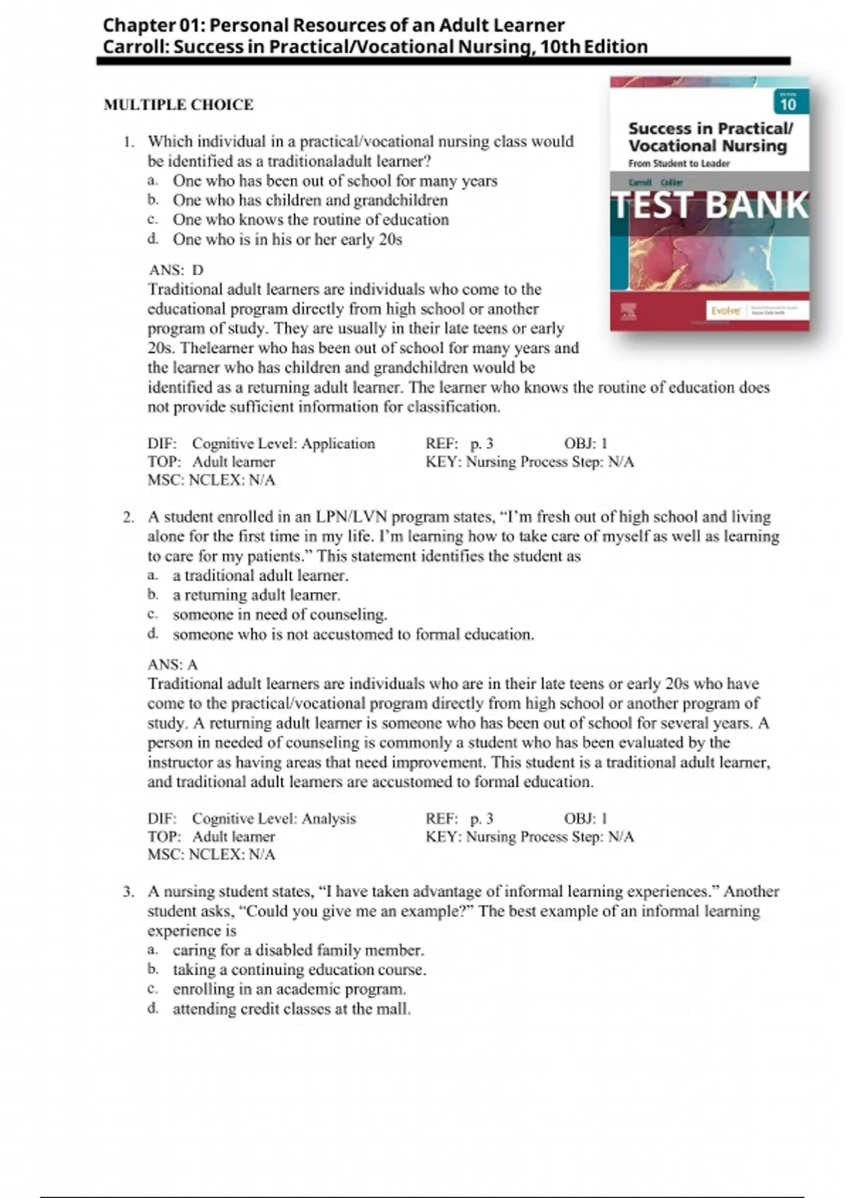 Download the complete Test Bank for Success in Practical/Vocational Nursing, 10th Edition by Carroll and Collier. This test bank provides comprehensive NCLEX-PN style questions with rationales covering fundamentals, clinical skills, patient care, nursing procedures, and practical nursing concepts—ideal for LPN/LVN students preparing for licensure and exams.