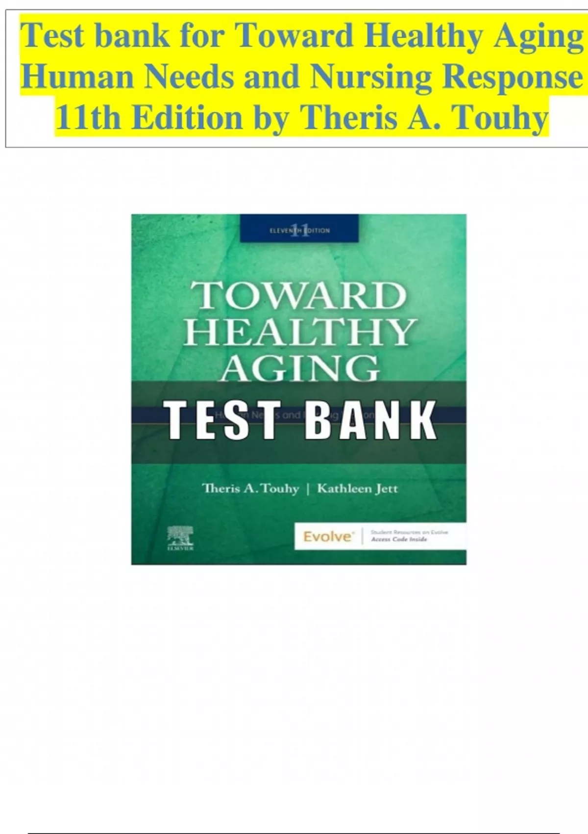 Access the complete Test Bank for Toward Healthy Aging: Human Needs and Nursing Response, 11th Edition by Theris A. Touhy. This resource includes NCLEX-style questions with rationales focused on gerontological nursing, chronic illness management, holistic care, and promoting wellness in aging adults. Ideal for nursing students preparing for exams on elderly care and healthy aging strategies.