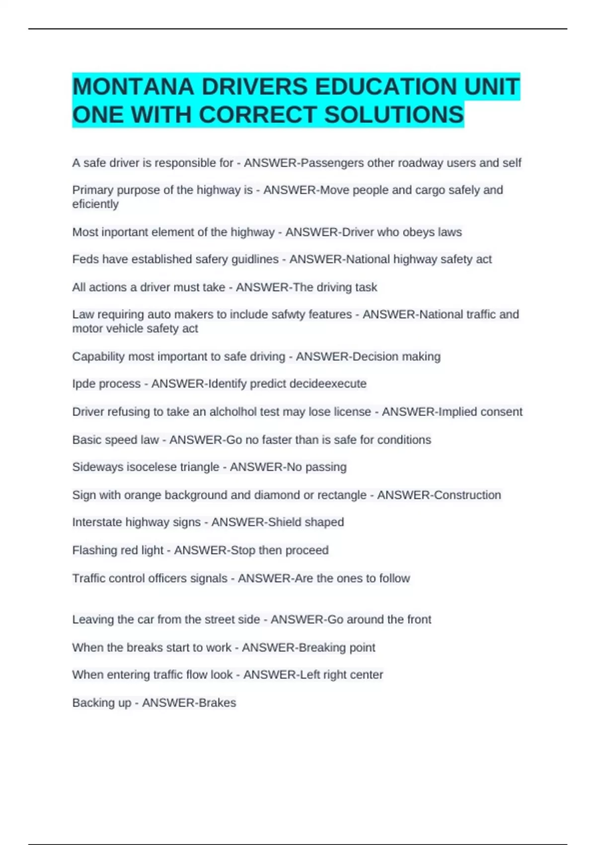 MONTANA DRIVERS EDUCATION UNIT ONE WITH CORRECT SOLUTIONSMONTANA DRIVERS EDUCATION UNIT ONE WITH CORRECT SOLUTIONSMONTANA DRIVERS EDUCATION UNIT ONE WITH CORRECT SOLUTIONS A safe driver is responsible for - ANSWER-Passengers other roadway users and self Primary purpose of the highway is - ANSWER-Move people and cargo safely and eficiently Most inportant element of the highway - ANSWER-Driver who obeys laws Feds have established safery guidlines - ANSWER-National highway safety act
