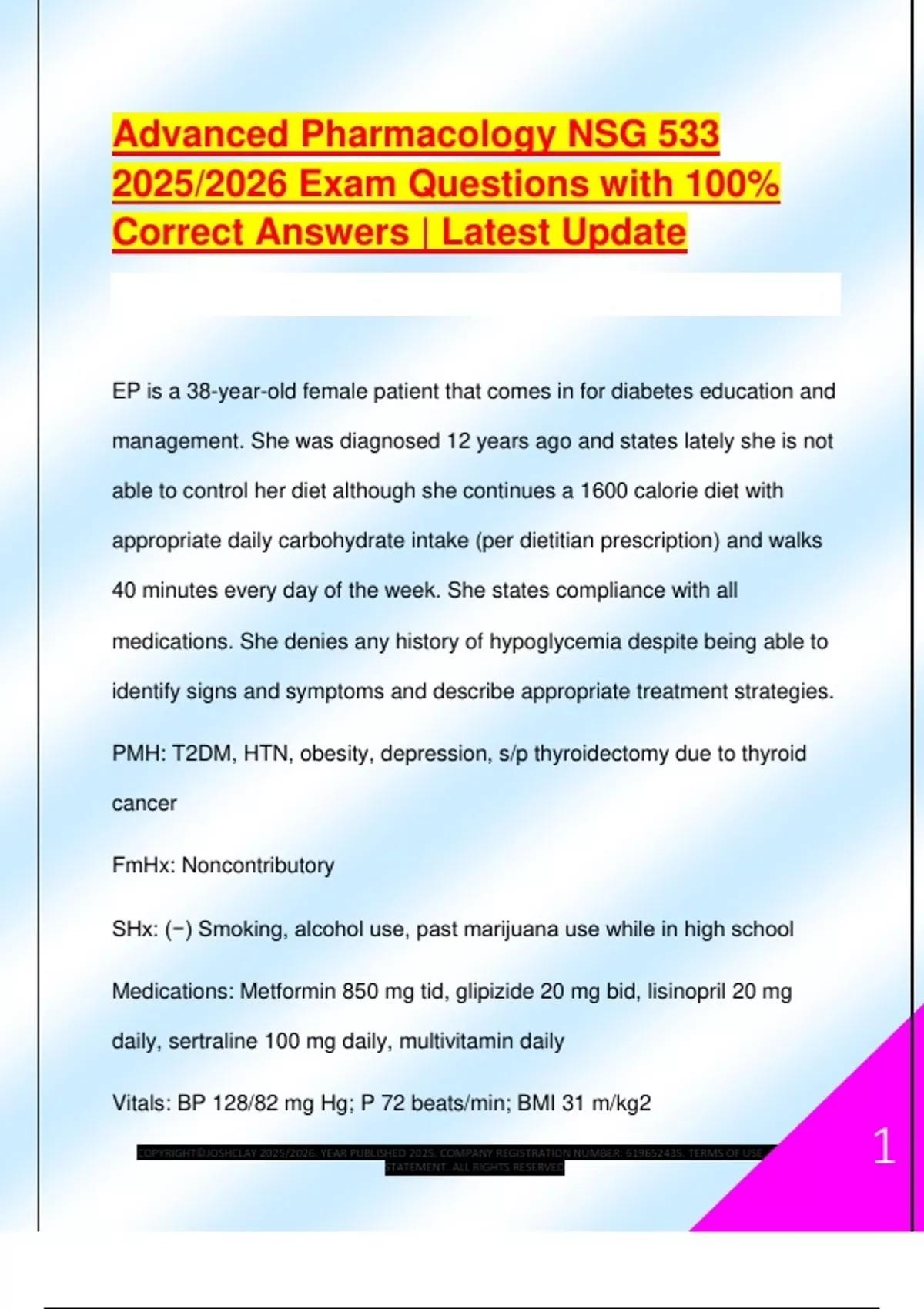 Advanced Pharmacology NSG 533 2025/2026 Exam Questions with 100% Correct Answers | Latest Update EP is a 38-year-old female patient that comes in for diabetes education and management. She was diagnosed 12 years ago and states lately she is not able to control her diet although she continues a 1600 calorie diet with appropriate daily carbohydrate intake (per dietitian prescription) and walks 40 minutes every day of the week. She states compliance with all medications. She denies any history of hypoglycemia despite being able to identify signs and symptoms and describe appropriate treatment strategies. PMH: T2DM, HTN, obesity, depression, s/p thyroidectomy due to thyroid cancer FmHx: Noncontributory SHx: (−) Smoking, alcohol use, past marijuana use while in high school Medications: Metformin 850 mg tid, glipizide 20 mg bid, lisinopril 20 mg daily, sertraline 100 mg daily, multivitamin daily Vitals: BP 128/82 mg Hg; P 72 beats/min; BMI 31 m/kg2