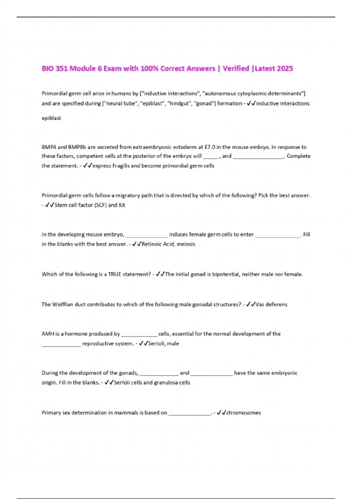 Package deal::: BIO 351 Exams with 100% Correct Answers | Verified |Latest 2025