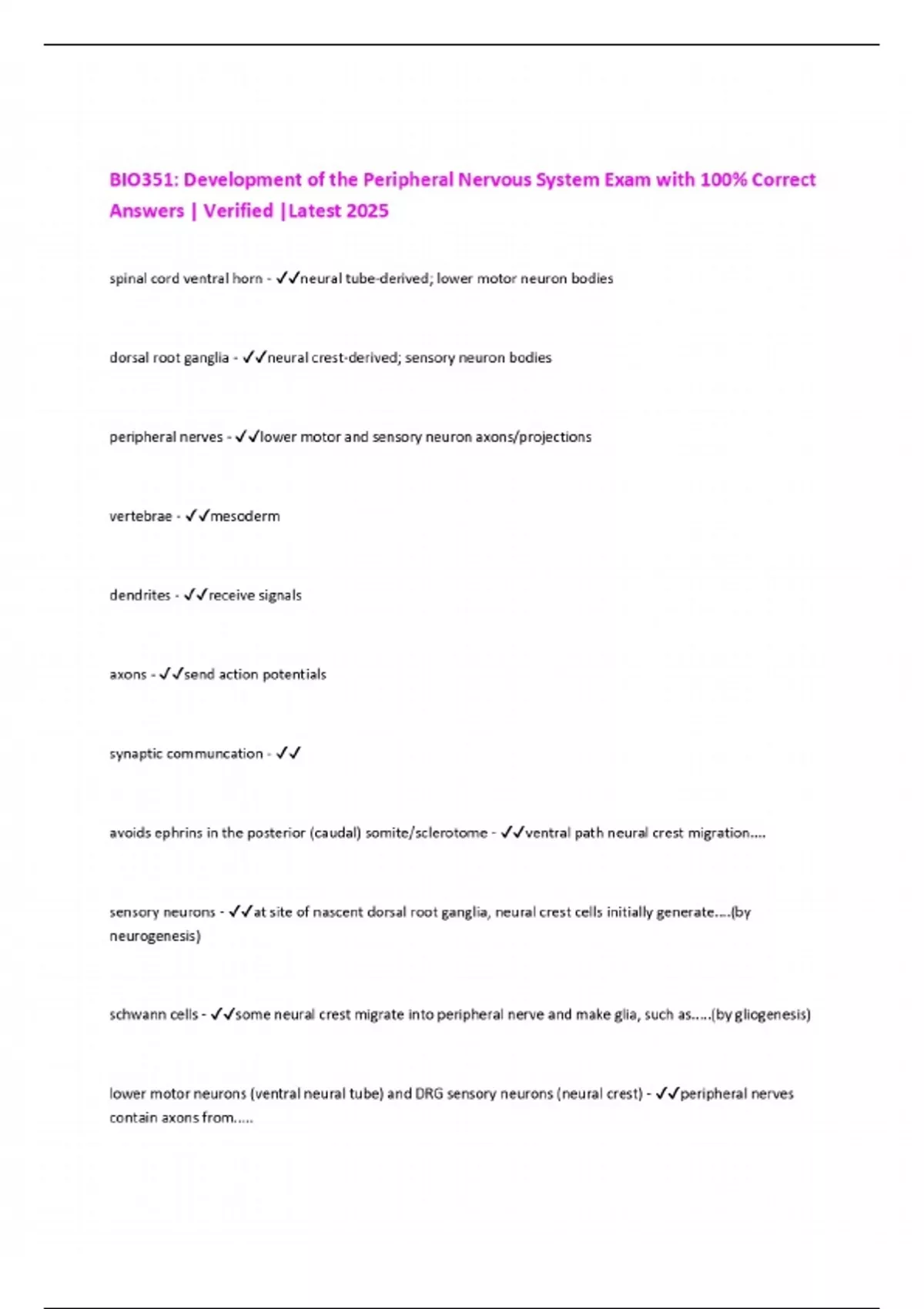 BIO351: Development of the Peripheral Nervous System Exam with 100% Correct Answers | Verified |Latest 2025
