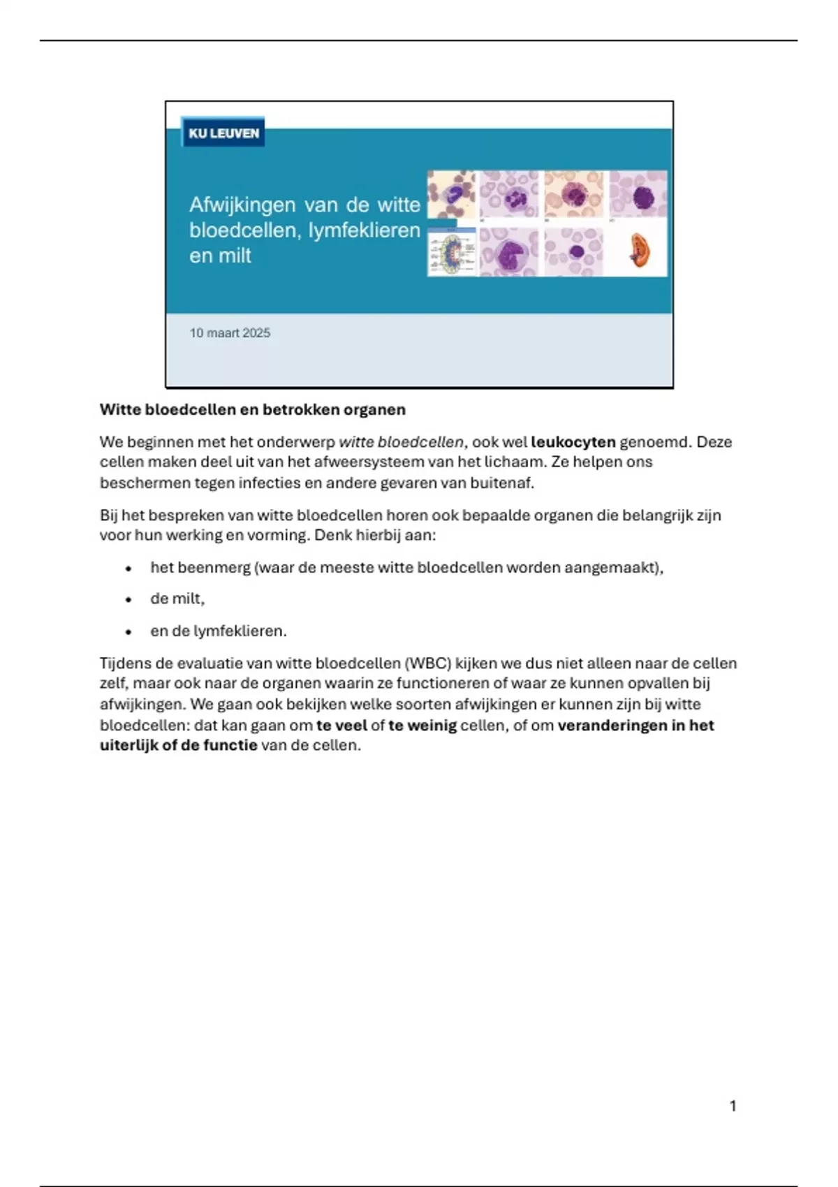 Bij het bespreken van witte bloedcellen horen ook bepaalde organen die belangrijk zijn
