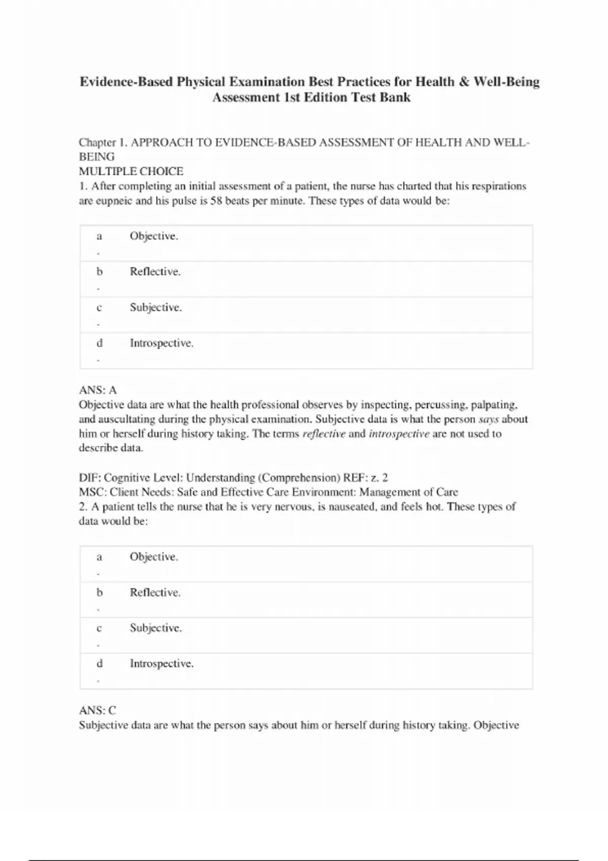 Test Bank For Evidence-Based Physical Examination Best Practices for Health & Well-Being Assessment 1st Edition By Kate Sustersic Gawlik, Bernadette Mazurek Melnyk, Alice M. Teall. 1. Approach to Evidence-Based Assessment of Health and Well-Being 2. Evidence-Based History-Taking Approach for Wellness Exams, Episodic Visits, and Chronic Care Management 3. Approach to Implementing and Documenting Patient-Centered, Culturally Sensitive Evidence-Based Assessment 4. Evidence-Based Assessment of Children and Adolescents 5. Approach to the Physical Examination: General Survey and Assessment of Vital Signs 6. Evidence-Based Assessment of the Heart and Circulatory System 7. Evidence-Based Assessment of the Lungs and Respiratory System 8. Approach to Evidence-Based Assessment of Body Habitus (Height, Weight, Body Mass Index, Nutrition) 9. Evidence-Based Assessment of Skin, Hair, and Nails 10. Evidence-Based Assessment of the Lymphatic System 11. Evidence-Based Assessment of the Head and Neck 12. Evidence-Based Assessment of the Eye 13. Evidence-Based Assessment of the Ears, Nose, and Throat 14. Evidence-Based Assessment of the Nervous System 15. Evidence-Based Assessment of the Musculoskeletal System 16. Evidence-Based Assessment of the Abdominal, Gastrointestinal, and Urological Systems 17. Evidence-Based Assessment of the Breasts and Axillae 18. Evidence-Based Assessment of Sexual Orientation, Gender Identity, and Health 19. Evidence-Based Assessment of Male Genitalia, Prostate, Rectum, and Anus 20. Evidence-Based Assessment of the Female Genitourinary System 21. Evidence-Based Obstetric Assessment 22. Evidence-Based Assessment of Mental Health 23. Evidence-Based Assessment of Substance Use Disorder 24. Evidence-Based Assessment and Screening for Traumatic Experiences: Abuse, Neglect, and Intimate Partner Violence 25. Evidence-Based Therapeutic Communication and Motivational Interviewing in Health Assessment 26. Evidence-Based History and Physical Examinations for Sports Participation Evaluation 27. Using Health Technology in Evidence-Based Assessment 28. Evidence-Based Assessment of Personal Health and Well-Being for Clinicians: Key Strategies to Achieve Optimal Wellness 29. Evidence-Based Health and Well-Being Assessment: Putting it All Toget