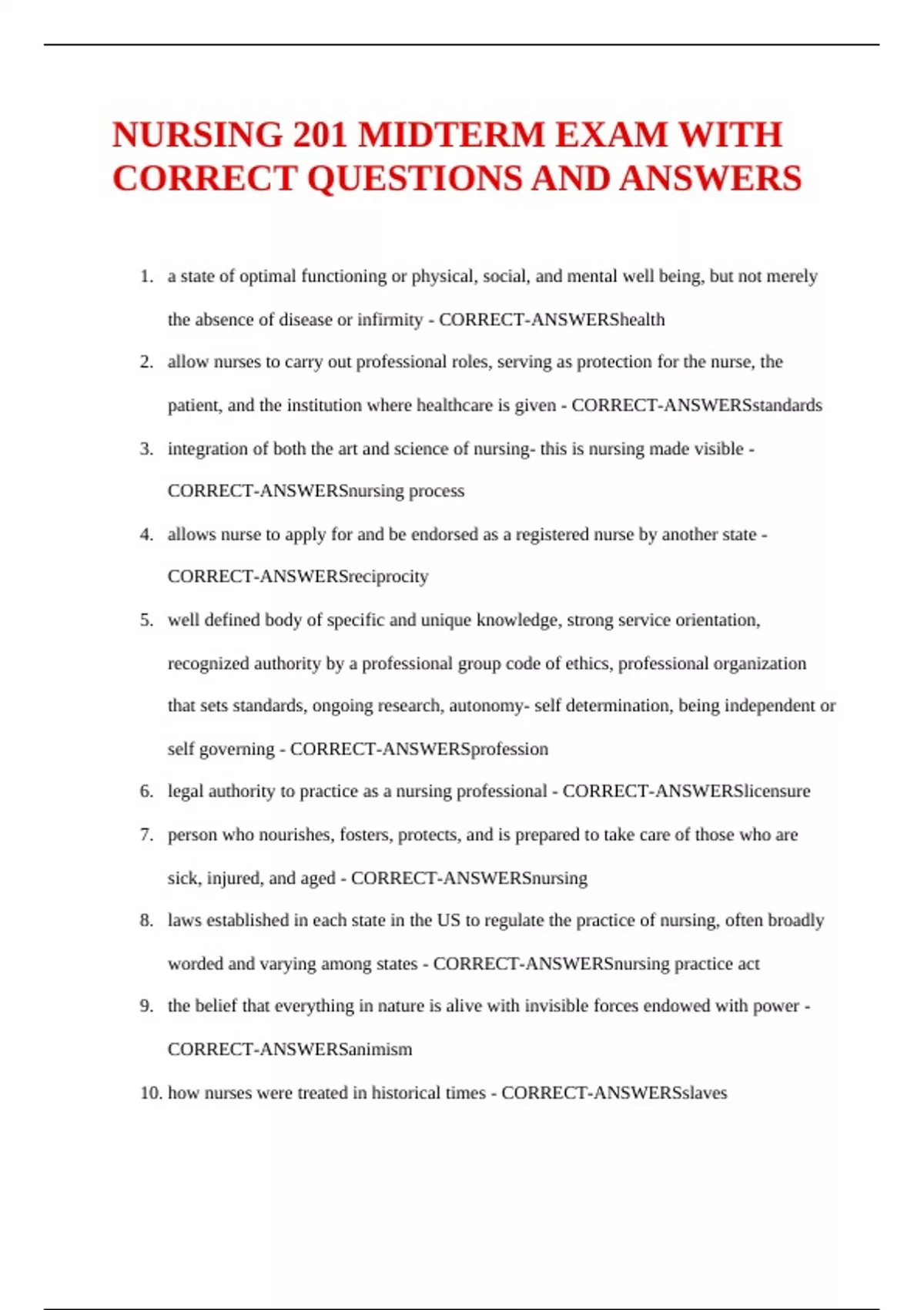 NURSING 201 MIDTERM EXAM WITH