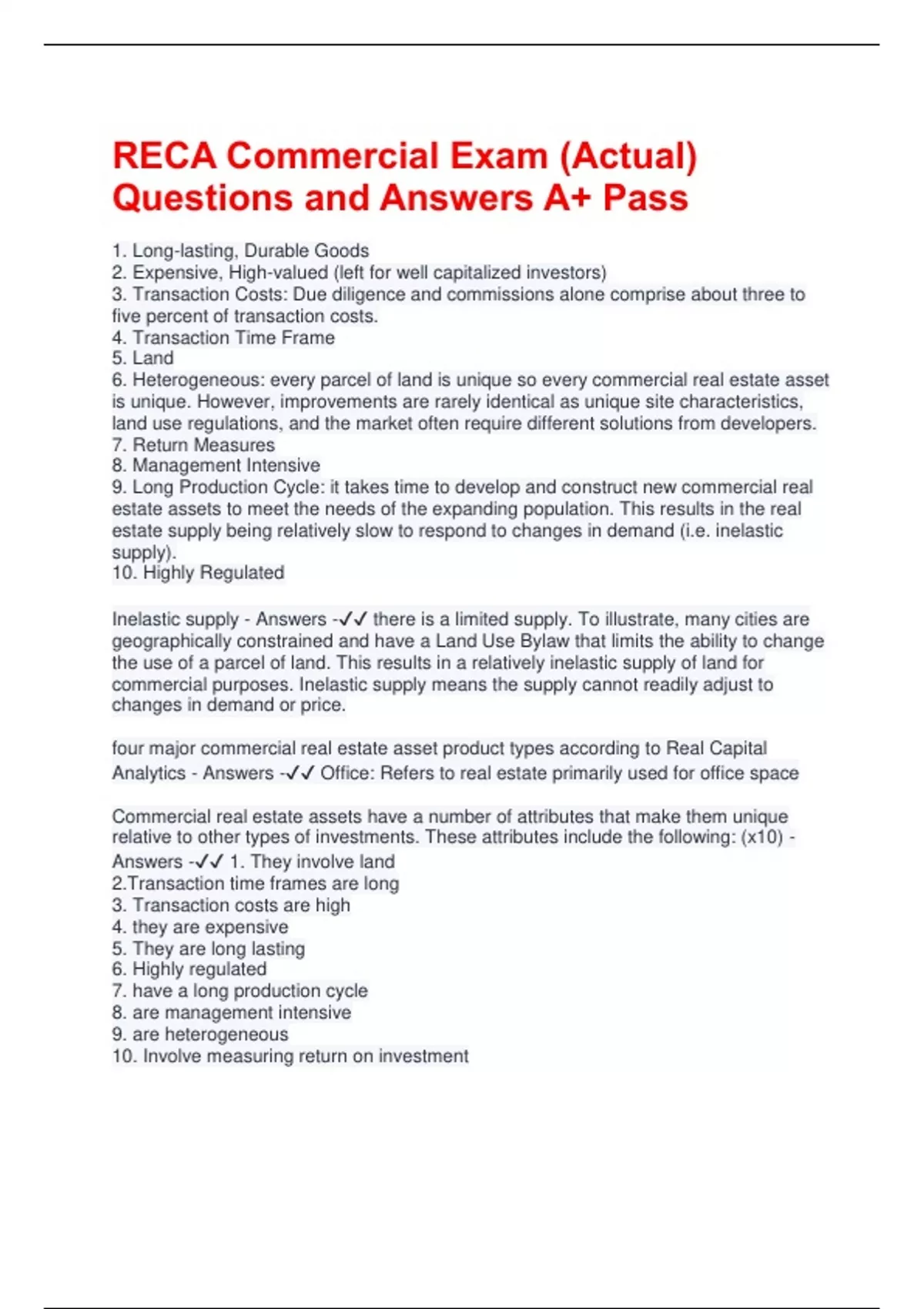 RECA Commercial Exam (Actual) Questions and Answers A+ Pass 1. Long-lasting, Durable Goods 2. Expensive, High-valued (left for well capitalized investors) 3. Transaction Costs: Due diligence and commissions alone comprise about three to five percent of transaction costs. 4. Transaction Time Frame 5. Land 6. Heterogeneous: every parcel of land is unique so every commercial real estate asset is unique. However, improvements are rarely identical as unique site characteristics, land use regulations, and the market often require different solutions from developers. 7. Return Measures 8. Management Intensive 9. Long Production Cycle: it takes time to develop and construct new commercial real estate assets to meet the needs of the expanding population. This results in the real estate supply being relatively slow to respond to changes in demand (i.e. inelastic supply). 10. Highly Regulated Inelastic supply - Answers - there is a limited supply. To illustrate, many cities are geographically constrained and have a Land Use Bylaw that limits the ability to change the use of a parcel of land. This results in a relatively inelastic supply of land for commercial purposes. Inelastic supply means the supply cannot readily adjust to changes in demand or price. four major commercial real estate asset product types according to Real Capital Analytics - Answers - Office: Refers to real estate primarily used for office space Commercial real estate assets have a number of attributes that make them unique relative to other types of investments. These attributes include the following: (x10) - Answers - 1. They involve land 2.Transaction time frames are long 3. Transaction costs are high 4. they are expensive 5. They are long lasting 6. Highly regulated 7. have a long production cycle 8. are management intensive 9. are heterogeneous 10. Involve measuring return on investment Retail: Refers to retail properties, such as strip centres or neighbourhood, community, regional and super-regional shopping malls Industrial: Refers to real estate for industrial use, such as distribution, manufacturing, or warehouse facilities and data centres Apartment: Refers to multi-family rental properties. Other miscellaneous product types include hotels, leisure (e.g golf courses), and special use (e.g. casinos) 3 miscellaneous product types - Answers - hotel, leisure (e.g. golf courses), and special use (e.g. casinos). Categorization by Building Class - Answers - For example, office properties are often categorized as Class A, B, or C. Categorization by Number of Storeys - Answers - For example, apartment properties are classified as either garden complexes (one or more low-rise buildings consisting of four storeys or less) or mid/high-rise projects (one or more buildings consisting of four storeys or greater). Categorization by building's Property Location - Answers - For example, in addition to building class, office properties are often categorized based on their location as either central business district (CBD) or suburban. Categorization by building's Type - Answers - For example, the International Council of Shopping Centres (ICSC) defines different types of shopping centres according to size (gross leasable area and land area), types of tenants, and trade area. The length of time for the Commercial Real Estate Asset Life Cycle process varies considerably depending on a number of factors, including the following: (x5) - Answers - The real estate asset's product type The size and complexity of the project The regulatory environment The need for related infrastructure The financial and operational capability of the investor(s) A typical commercial real estate asset undergoes three phases during its life cycle: - Answers - Phase I: Land Acquisition and Development Phase II: Building Construction Phase III: Operations and Asset Management Phase I: Land Acquisition and Development During Phase I, the developer acquires the land and undertakes the necessary development and pre-construction work. This involves the following: (x3) - Answers - Completing a feasibility analysis Enlisting the professional services of planning specialists, architects, engineers and contractors, and marketing experts Soliciting capital providers (e.g. investors, lenders) True or False - With the exception of a multi-family project, usually some pre-leasing must be in place. - Answers - True - Capital providers often require pre-leasing, which involves obtaining lease commitments in advance of construction. In fact, a construction lender may not commit construction funds until there are leasing commitments for a certain percentage of the space. With the exception of a multi-family project, usually some pre-leasing must be in place. Once lease up of the rest of the asset is complete (i.e. full occupancy), most of the risk associated with the development is eliminated. Four professional organizations that represent both property management and asset management professionals. - Answers - Building Owners and Managers Association (BOMA) Institute of Real Estate Management (IREM) National Council of Real Estate Investment Fiduciaries (NCREIF) Real Property Association of Canada (REALpac) True or False - In the process of operating and maintaining a real estate asset, the property manager is responsible first to the tenant - Answers - False - In the process of operating and maintaining a real estate asset, the property manager is responsible first to the investor and second to the tenants. The property manager is expected to follow the investor's lawful instructions.