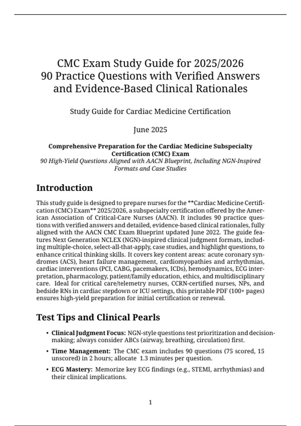 This CMC (Cardiac Medicine Certification) Exam Study Guide for the 2025/2026 cycle provides 90 carefully selected practice questions, each with verified answers and evidence-based clinical rationales. The content is aligned with current cardiac care standards and covers core topics such as hemodynamics, arrhythmias, acute coronary syndromes, heart failure, pharmacologic therapies, and critical care nursing interventions. Perfect for nurses preparing to earn their CMC credential and strengthen their clinical judgment in cardiac medicine.