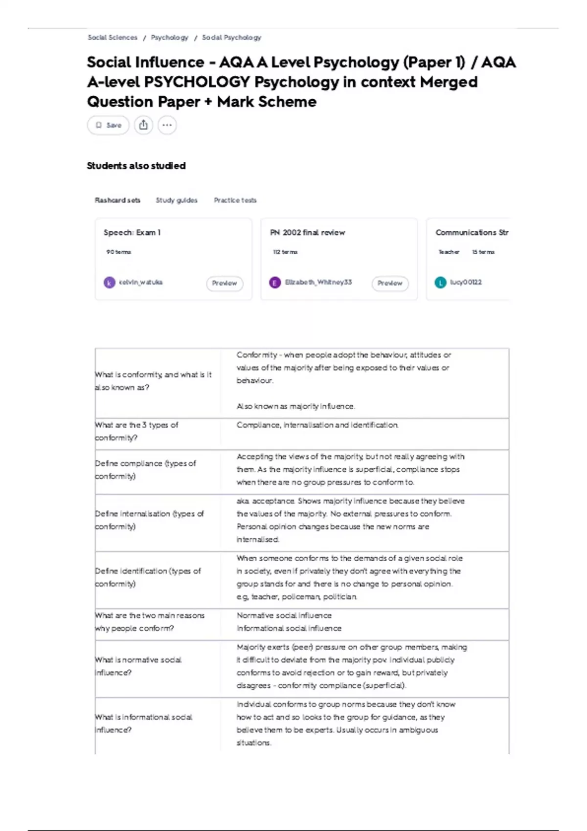 Social Influence - AQA A Level Psychology (Paper 1) / AQA
