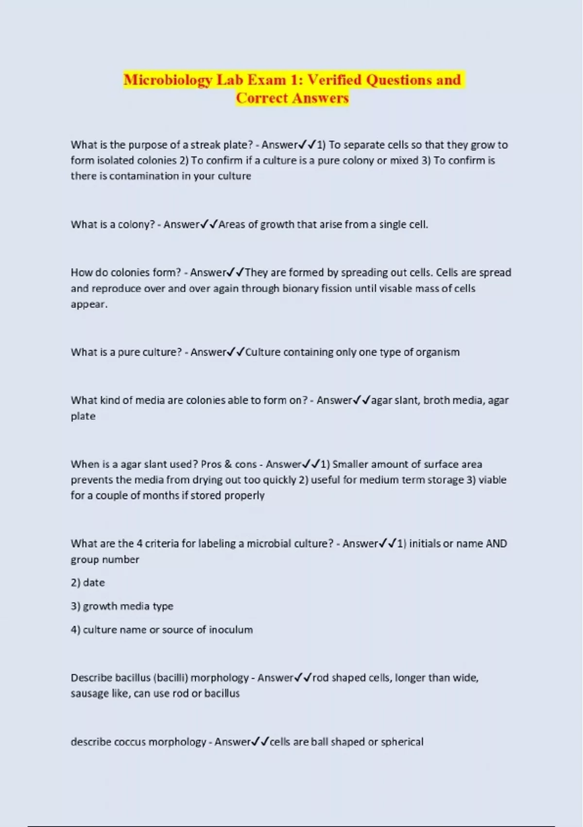 Microbiology Lab Exam 1: Verified Questions and Correct Answers