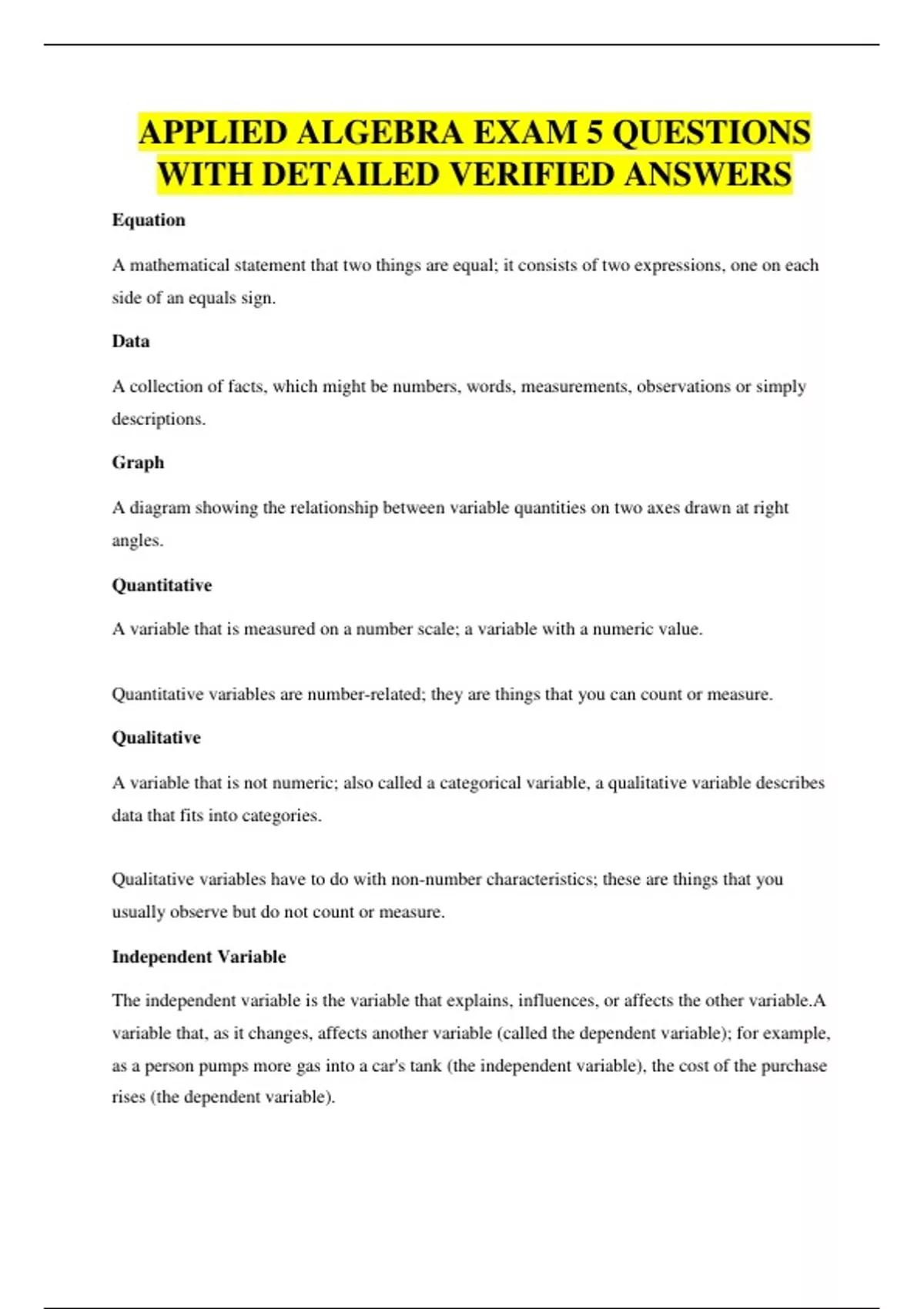 APPLIED ALGEBRA EXAM 5 QUESTIONS WITH DETAILED VERIFIED ANSWERS