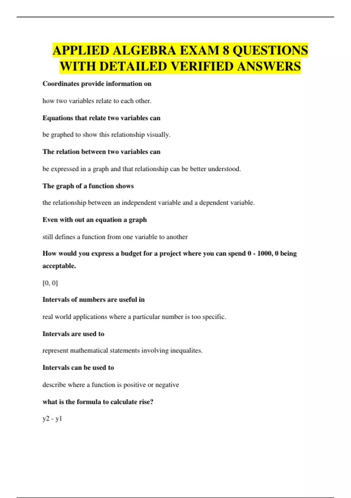 APPLIED ALGEBRA EXAM 8 QUESTIONS WITH DETAILED VERIFIED ANSWERS