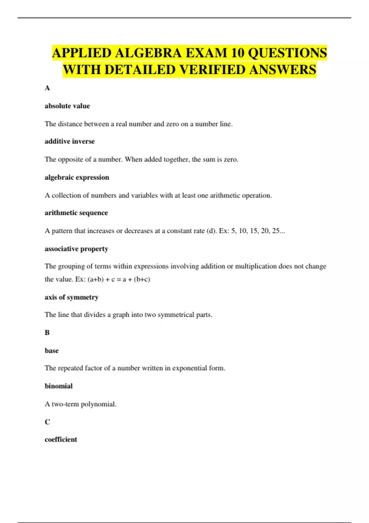 APPLIED ALGEBRA EXAM 10 QUESTIONS WITH DETAILED VERIFIED ANSWERS