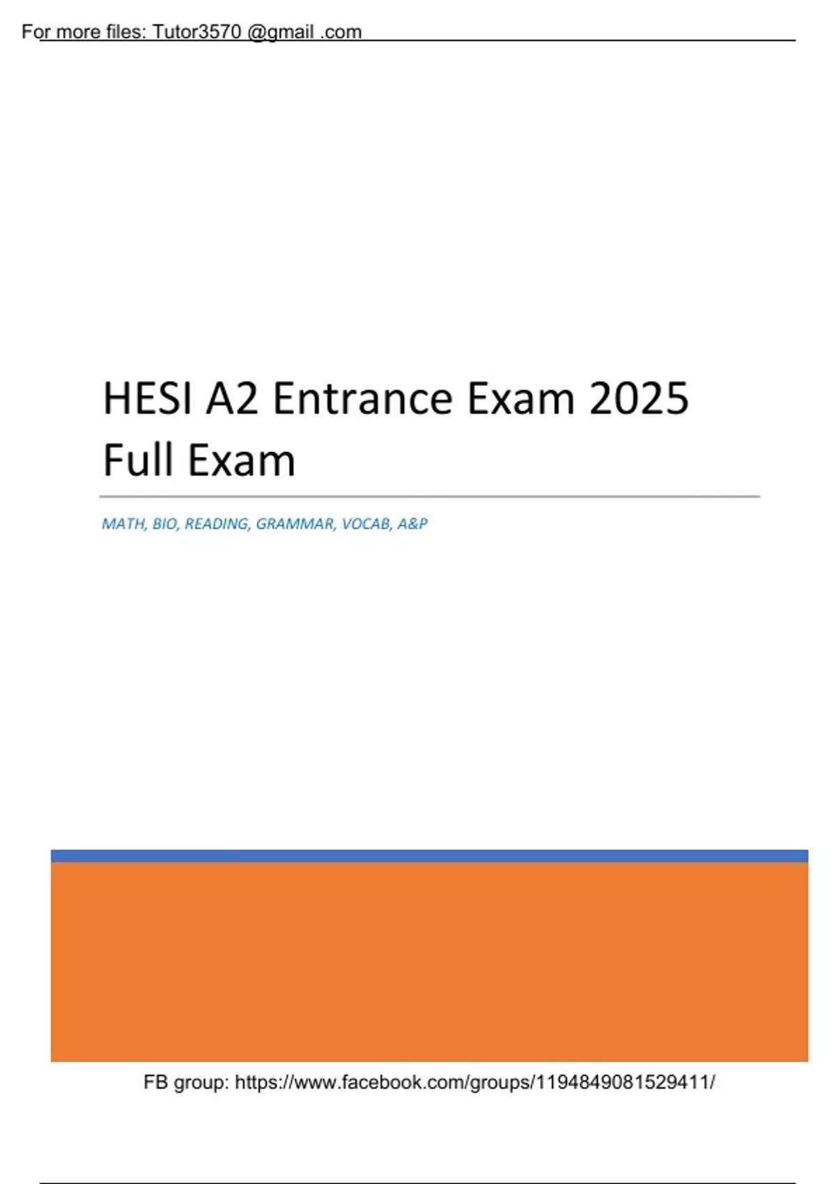 This document contains real exam questions from the 2025 HESI A2 Entrance Exam, including questions from core sections such as Math, Reading Comprehension, Grammar, and Anatomy & Physiology. Each question is accompanied by clear and concise answer. Ideal for nursing school applicants preparing for the official HESI A2 test, this material provides a realistic and up-to-date view of the actual exam format.