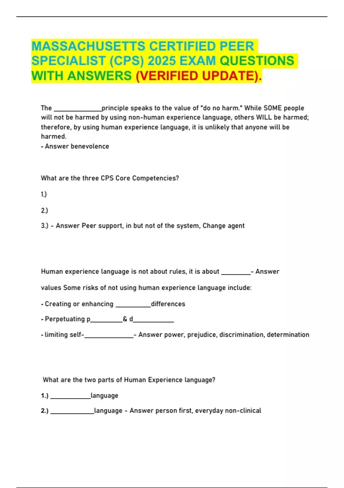 MASSACHUSETTS CERTIFIED PEER SPECIALIST (CPS) 2025 EXAM QUESTIONS WITH ANSWERS (VERIFIED UPDATE). The principle speaks to the value of "do no harm." While SOME people will not be harmed by using non-human experience language, others WILL be harmed; therefore, by using human experience language, it is unlikely that anyone will be harmed. - Answer benevolence What are the three CPS Core Competencies? 1.) 2.) 3.) - Answer Peer support, in but not of the system, Change agent Human experience language is not about rules, it is about - Answer values Some risks of not using human experience language include: - Creating or enhancing differences - Perpetuating p & d - limiting self- - Answer power, prejudice, discrimination, determination What are the two parts of Human Experience language? 1.) language 2.) language - Answer person first, everyday non-clinical When a CPS utilizes language, they act as a change agent by setting an uncompromising example that all people are greater than and come before any label or judgement. - Answer human experience When a CPS utilizes human experience language, they act as a agent by setting an uncompromising example that all people are greater than and come before any l or j - Answer change, label, judgement is the shared values, behaviors, traditions, customs, symbols, history, and ways of thinking/living of a group of people - Answer culture We don't see things as are. We see them as are. - Answer they, we The three critical elements to exploring cross-cultural partnerships are: 1.) learning about 2.) learning about 3.) learning about - Answer yourself, cultures, individuals When exploring cross-cultural partnerships, learning about ourselves indicates learning about our b and p - Answer biases, privilege When exploring cross-cultural partnerships, questions to ask when learning about ourselves may include: - What b do I carry? - What p have I benefited from? - How can these things impact the way that I r to certain issues? - How might the parts of my identity that I view to be important i with the beliefs/cultures of others? - Answer biases, privilege, respond, intersect When exploring cross-cultural partnerships, questions to ask when learning about cultures may include: - What c or l barriers might arise when interacting with different groups? - What d have people from this culture commonly experienced and what impact might this have had on them? - What else can I do to l about this culture? - Answer communication, language, discrimination, learn When exploring cross-cultural partnerships, questions to ask when learning about an individual may include: -How am I avoiding making a about what I think I know? -What am I doing to learn about this person's b ? - What am I doing to learn how this person r to their culture? - Answer assumptions, beliefs, relat
