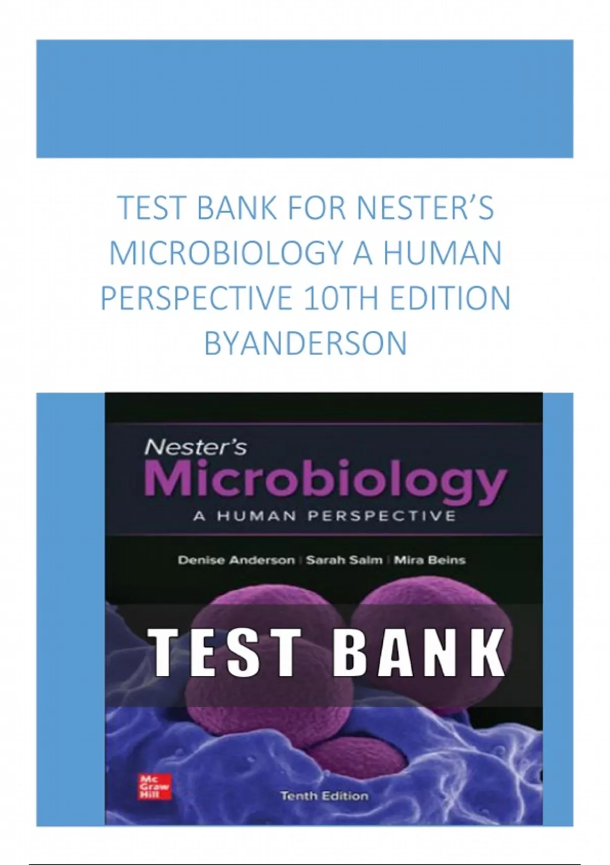 Get the complete test bank for Nester’s Microbiology: A Human Perspective, 10th Edition by Denise Anderson, Sarah Salm, and Eugene Nester. Includes detailed questions—ideal for nursing, allied health, and microbiology exam prep.
