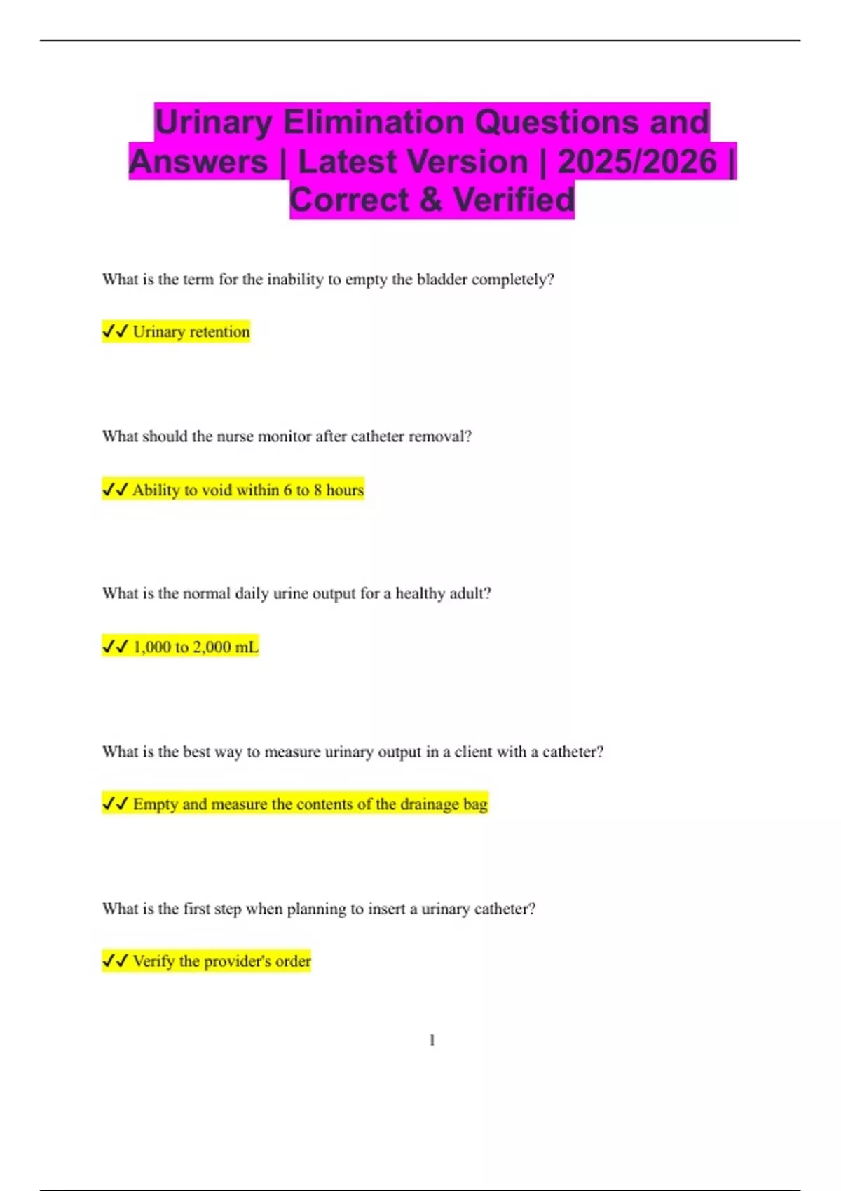 Urinary Elimination Questions and Answers | Latest Version | 2025/2026 | Correct & Verified What is the term for the inability to empty the bladder completely? Urinary retention What should the nurse monitor after catheter removal? Ability to void within 6 to 8 hours What is the normal daily urine output for a healthy adult? 1,000 to 2,000 mL What is the best way to measure urinary output in a client with a catheter? Empty and measure the contents of the drainage bag What is the first step when planning to insert a urinary catheter? Verify the provider's order 2 What should the nurse do if urine becomes cloudy and foul-smelling? Notify the provider as it may indicate infection What is the term for unintentional leakage of urine during coughing or laughing? Stress incontinence What should the nurse encourage to help a client void naturally? Run water and provide privacy What is the purpose of a bladder scan? To assess the amount of urine retained in the bladder How does adequate hydration help urinary elimination? It promotes regular and dilute urine output What is a common cause of urinary tract infections in women? Improper perineal hygiene from back to front wiping 3 What nursing intervention helps prevent catheter-associated infections? Maintaining a closed drainage system What is the first action if a catheter is accidentally pulled out with the balloon inflated? Assess for bleeding and notify the provider What is the expected color of normal, healthy urine? Pale yellow to amber What is the purpose of a condom catheter? To collect urine in male clients without inserting a catheter What is the primary symptom of a urinary tract infection? Burning or pain during urination What is the term for waking up during the night to urinate? Nocturia