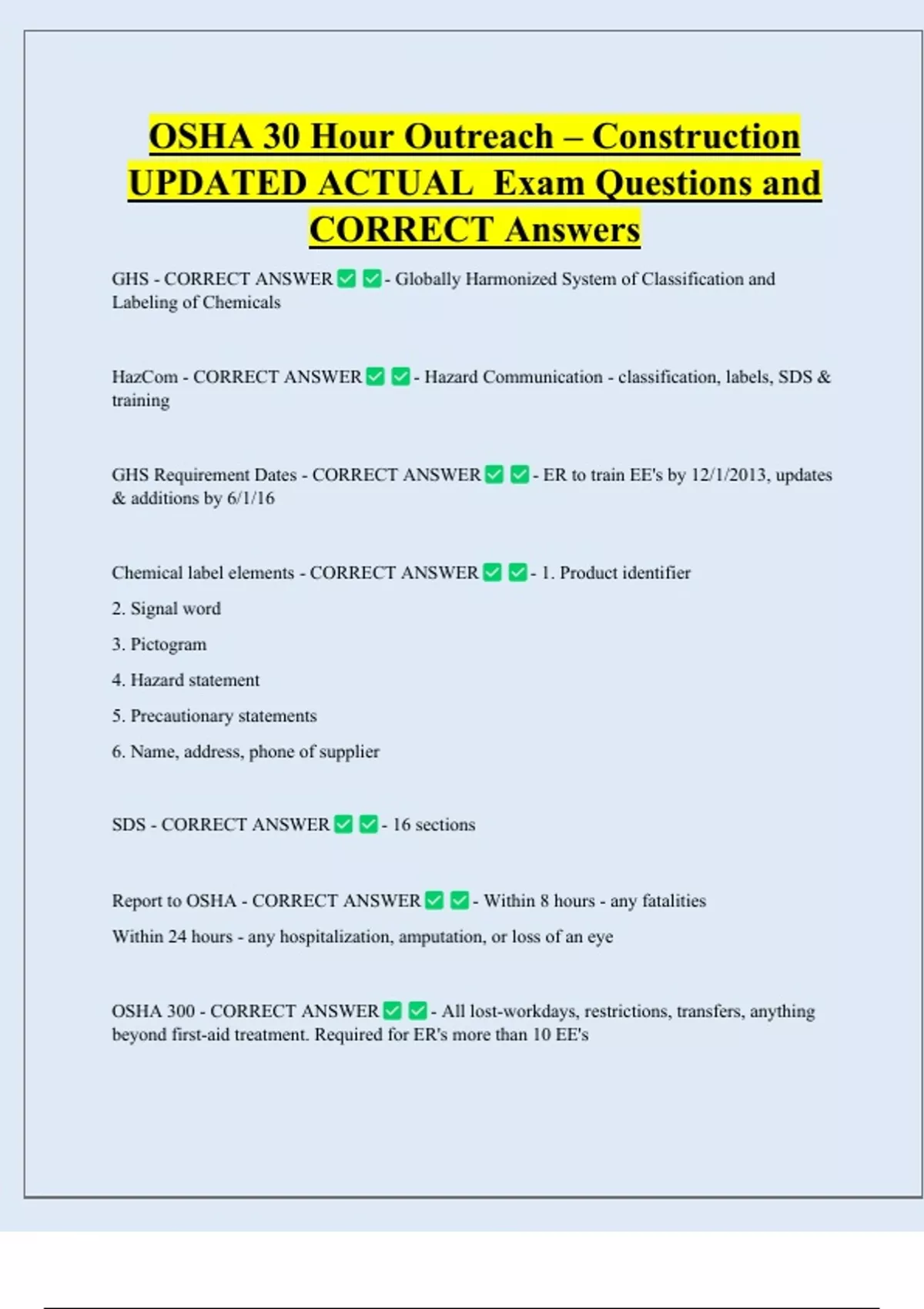 OSHA 30 Hour Outreach – Construction UPDATED ACTUAL Exam Questions and CORRECT Answers GHS - CORRECT ANSWER Labeling of Chemicals HazCom - CORRECT ANSWER training - Globally Harmonized System of Classification and - Hazard Communication - classification, labels, SDS & GHS Requirement Dates - CORRECT ANSWER & additions by 6/1/16 Chemical label elements - CORRECT ANSWER 2. Signal word 3. Pictogram 4. Hazard statement 5. Precautionary statements 6. Name, address, phone of supplier SDS - CORRECT ANSWER - 16 sections Report to OSHA - CORRECT ANSWER - ER to train EE's by 12/1/2013, updates