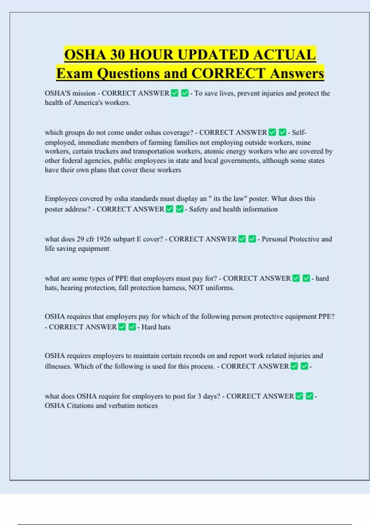 OSHA 30 HOUR UPDATED ACTUAL Exam Questions and CORRECT Answers OSHA'S mission - CORRECT ANSWER health of America's workers. - To save lives, prevent injuries and protect the which groups do not come under oshas coverage? - CORRECT ANSWER - Self employed, immediate members of farming families not employing outside workers, mine workers, certain truckers and transportation workers, atomic energy workers who are covered by other federal agencies, public employees in state and local governments, although some states have their own plans that cover these workers Employees covered by osha standards must display an " its the law" poster. What does this poster address? - CORRECT ANSWER - Safety and health information